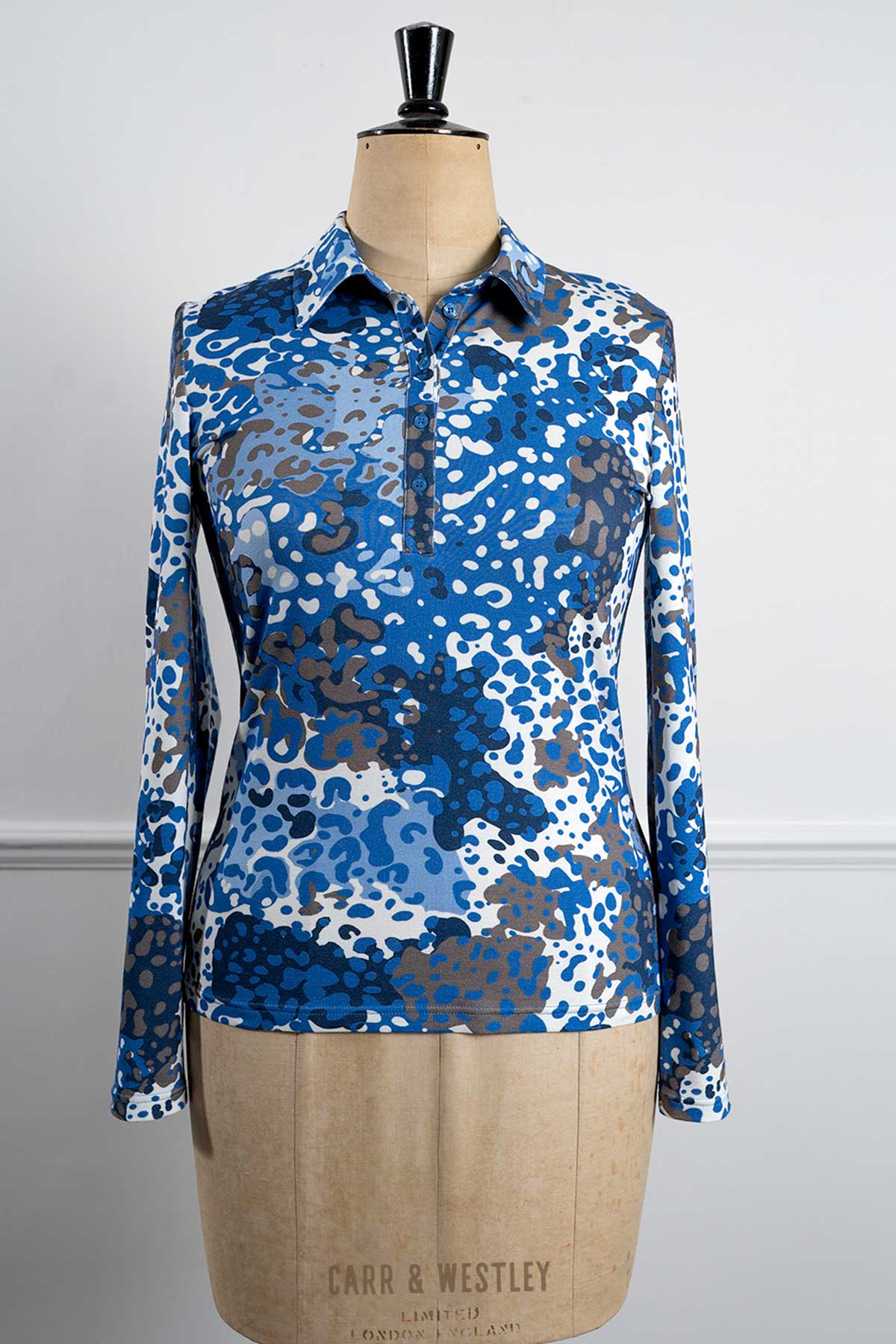 This abstract animal print top designed in a classic polo shirt style, offers effortless wear either for a casual look or dressed up with a pair of smart trousers. Styled with a four-button placket and long sleeves, it is a must have from Lebek for your new seasonal wardrobe. Back length from 24”. Machine washable. 95% viscose, 5% elastane. Made by Lebek.