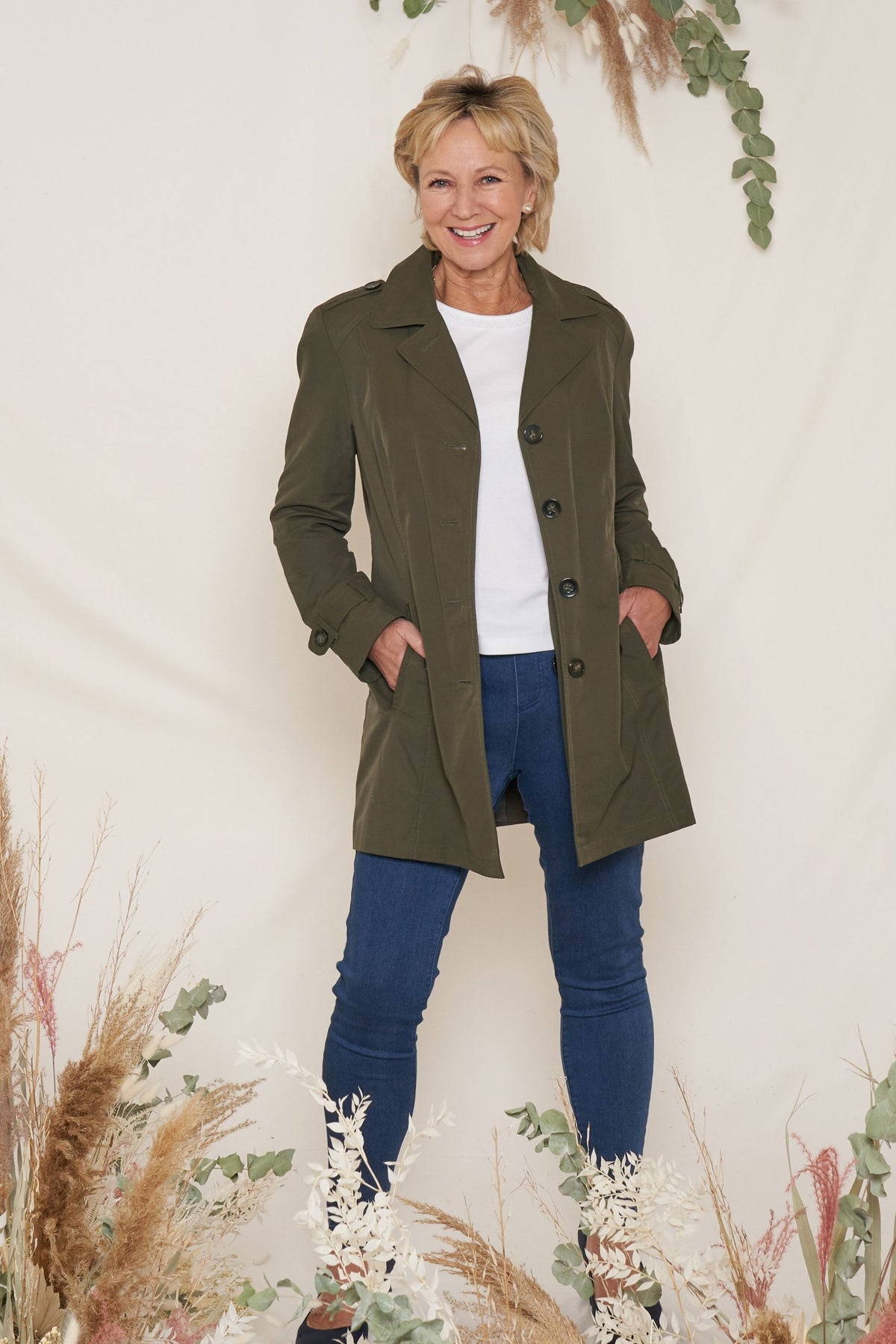 Single breasted trench coat, offers timeless style with the classic details of a lapel collar and subtle shoulder pads for shaping. Decorative horn-effect buttons, and sleeve tab detailing. Finished with two front pockets and small back vent. Back length from 32”. 63% cotton, 37% polyamide. Made by Lebek.