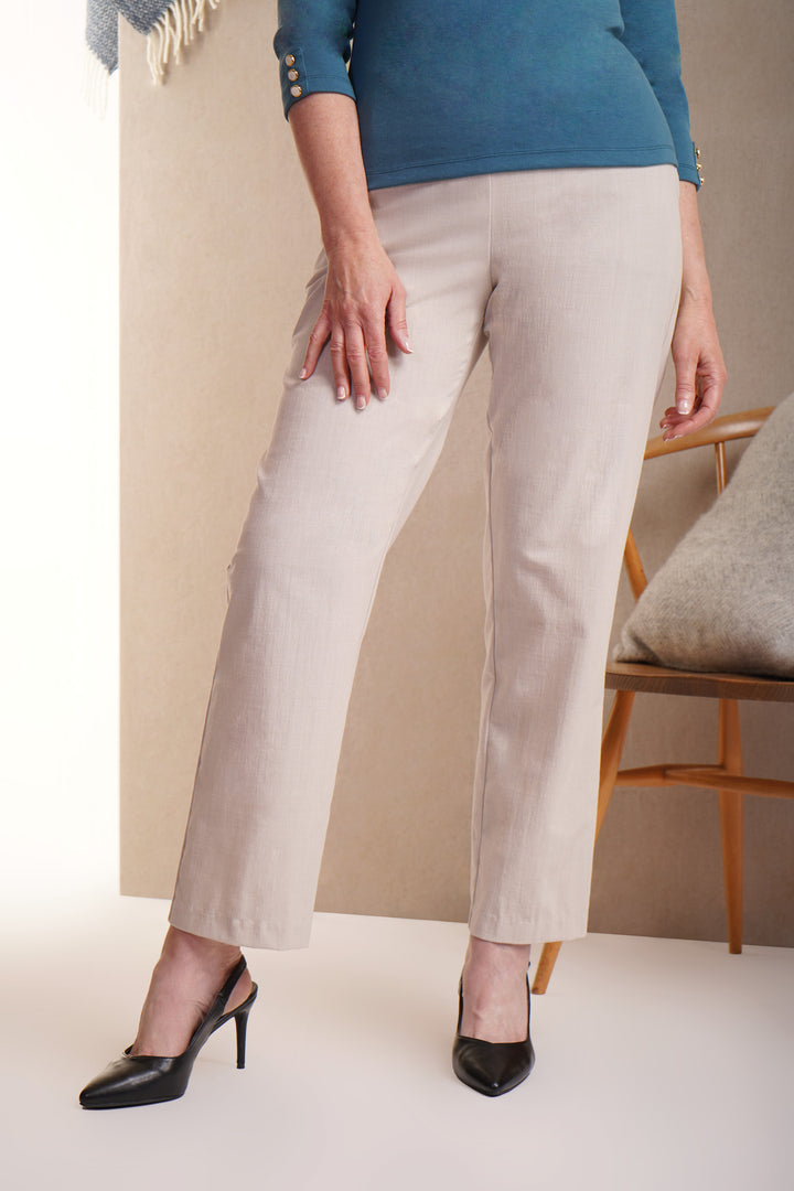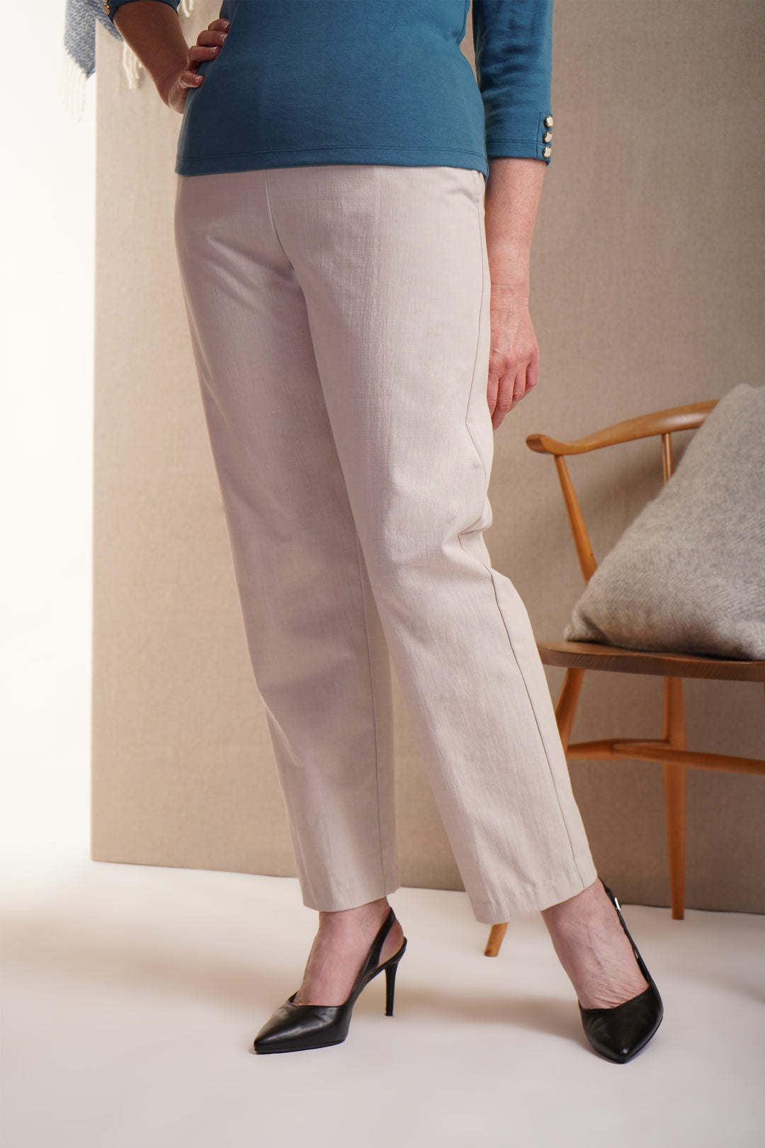 A gorgeous summer weight trouser, lovingly made to order by our team of seamstresses at Bourne Mill. Features an easy-fit, flat front elasticated waistband and two side pockets, these wear effortlessly with any t-shirt or top from your existing wardrobe to achieve a relaxed seasonal look. Machine washable at 30. 60% polyester, 40% cotton.
