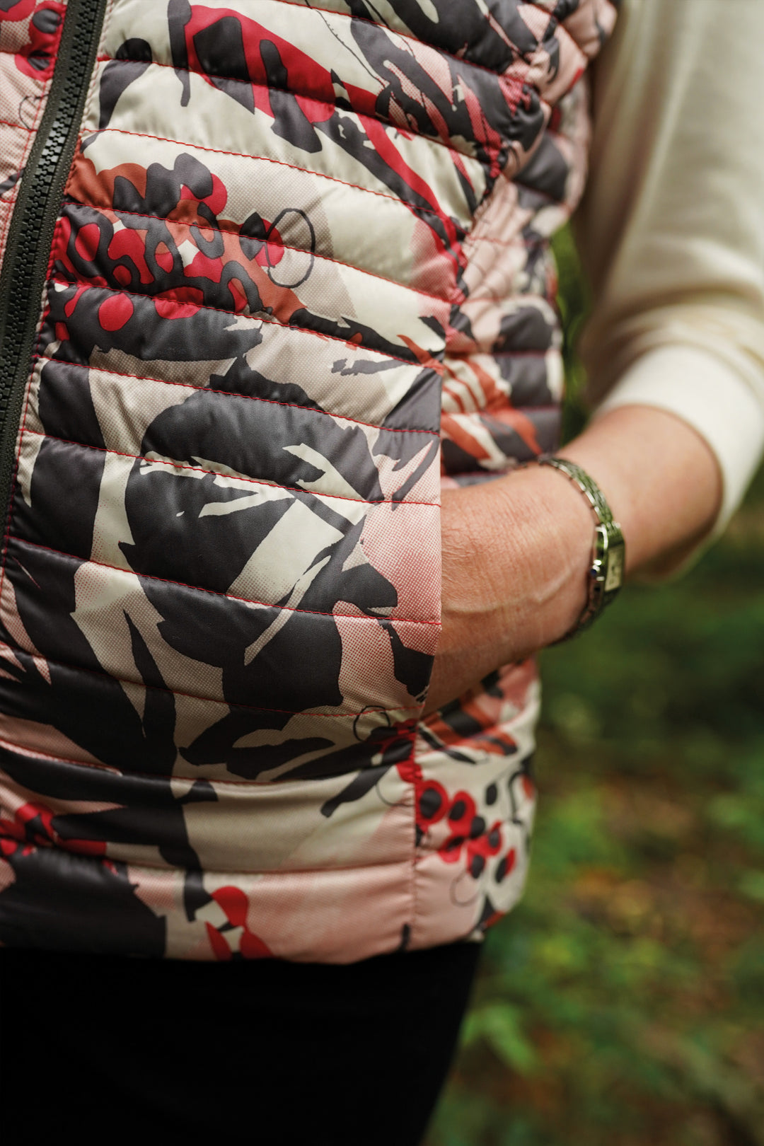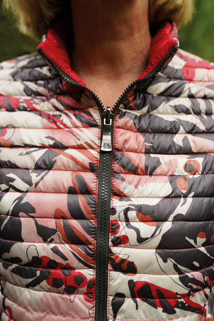This versatile gilet is a perfect addition to your outerwear collection. Featuring a vibrant red, quilted design and on the reverse a stylish abstract lava pattern, ideal for adding a pop of colour to your outdoor ensemble. It features a high collar, two pockets and a full-length zip, ensuring warmth and ease of wear. Back length from 23”. 100% polyester.