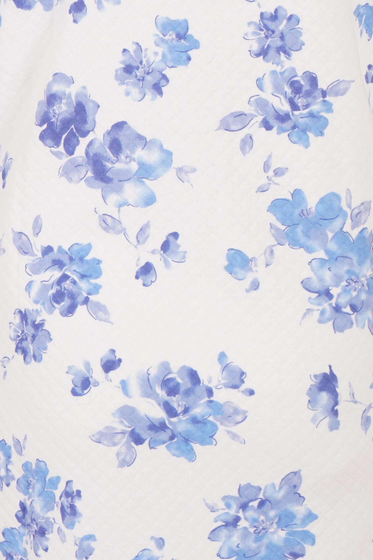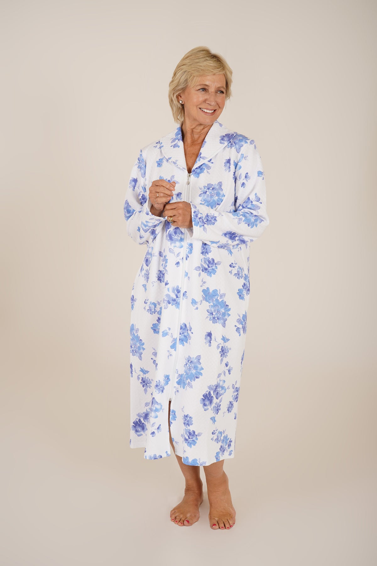 A classic housecoat designed in a delicate floral print on a white mock quilted fabric. Long sleeves, complete with a small shawl collar and two concealed pockets. Easy zip through front fastening. Back length from 46”. Machine washable at 30. 60% cotton, 40% polyester. Made by Slenderella.