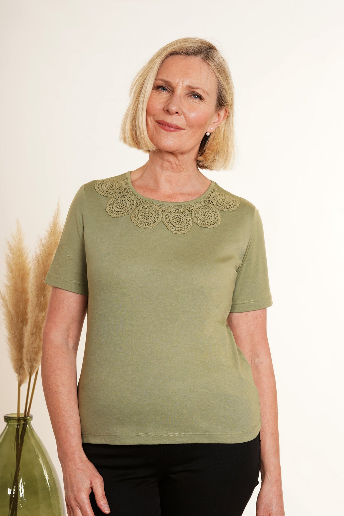 Feminine crochet lace panel styled onto a classic round neckline, perfect for dressing up summer outfits. Soft jersey top, with short sleeves and a straight hem. Back length from 23”. Machine washable at 30 degrees. 65% polyester, 35% cotton. Made by Poppy.
