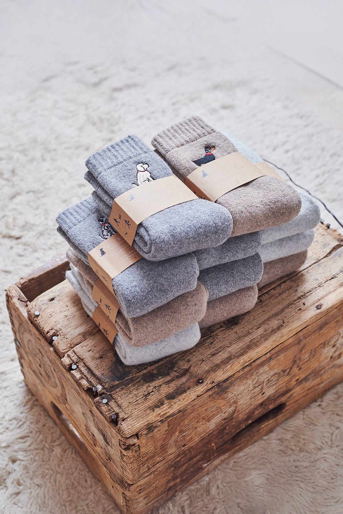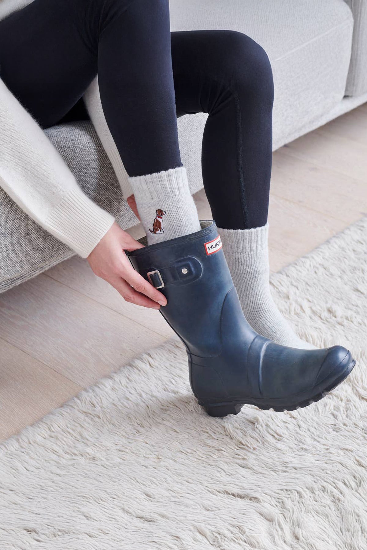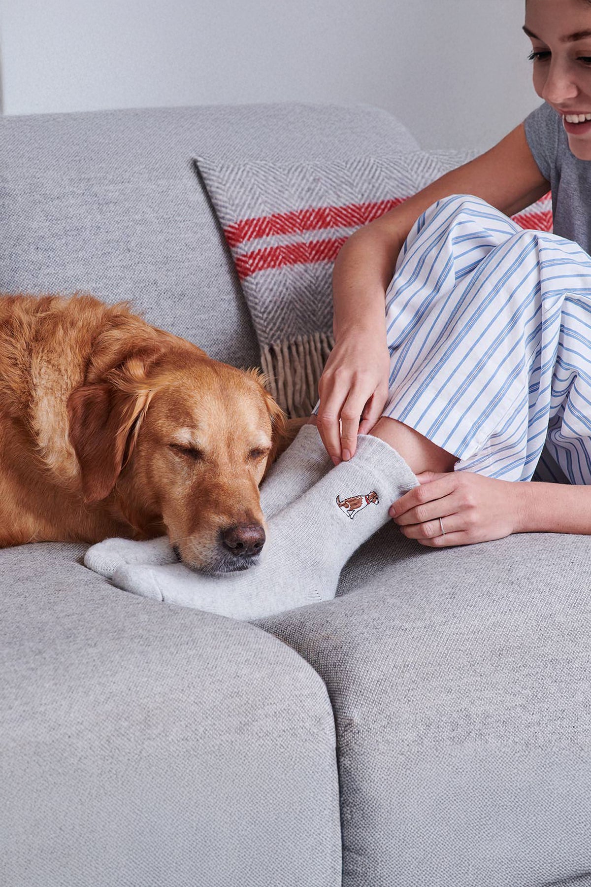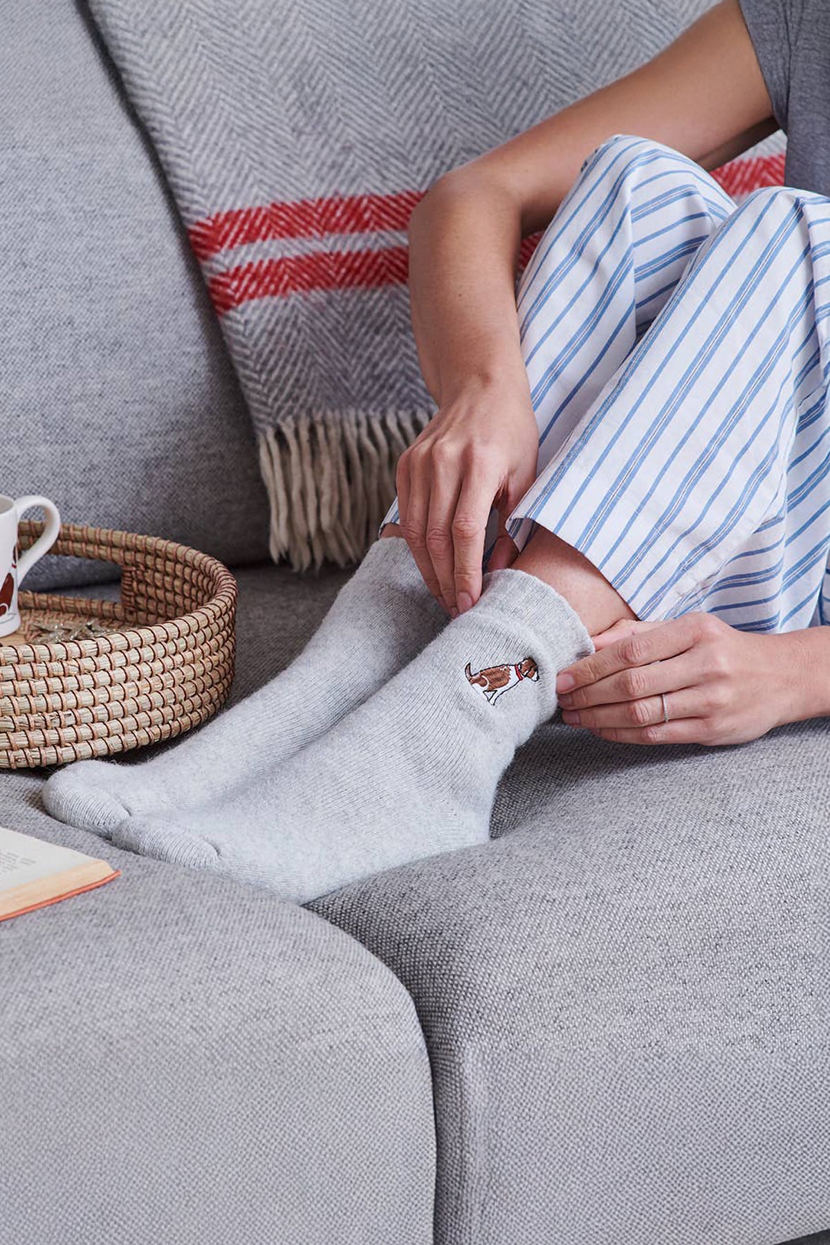 Our exceptionally soft dog walkers socks make the perfect gift for any dog lover. Not only will they keep feet warm on the daily dog walk, they are also ideal for getting cosy at home with your four legged friend. The perfect bedtime socks in the chilliest months! Featuring an adorable embroidered Liver & White Springer Spaniel on a pale grey wool background. Our dog walker socks are unisex and one size. They are stretchy enough to fit all the family. Made from 30% wool, 29% polyester, 21% acrylic, 17% nylon, 3% spandex Machine wash cold with similar colours.