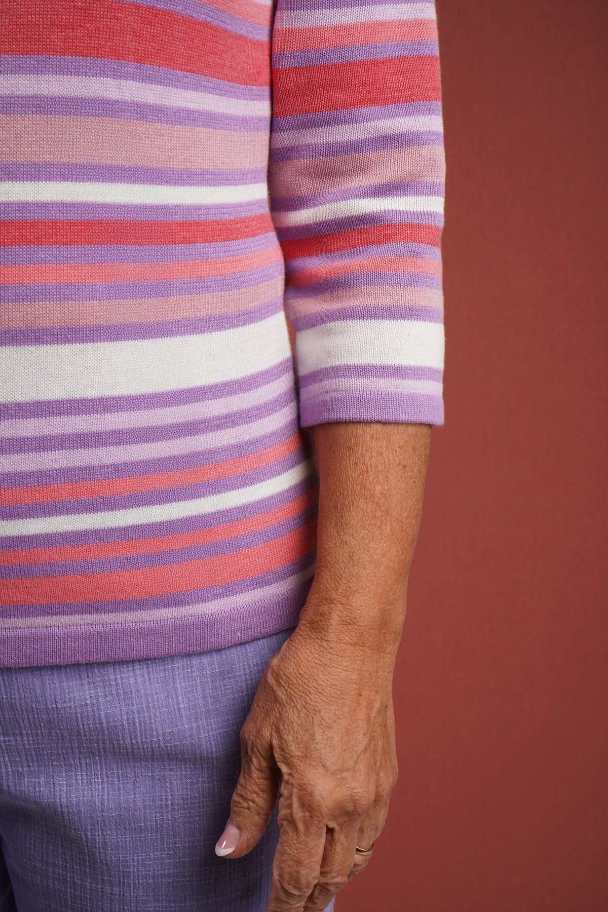 The Harper Striped Jumper combines contemporary style with practical comfort. This knitted top features a striking vibrant stripe pattern that adds visual interest to any wardrobe, whilst the classic round neckline offers timeless appeal. The three-quarter length sleeves provide versatile layering options, making it suitable for transitional seasons or casual everyday wear. Crafted from quality knit fabric, this piece delivers both durability and a refined finish that elevates basic styling. Back length from 24". 55% Acrylic, 45% Cotton.