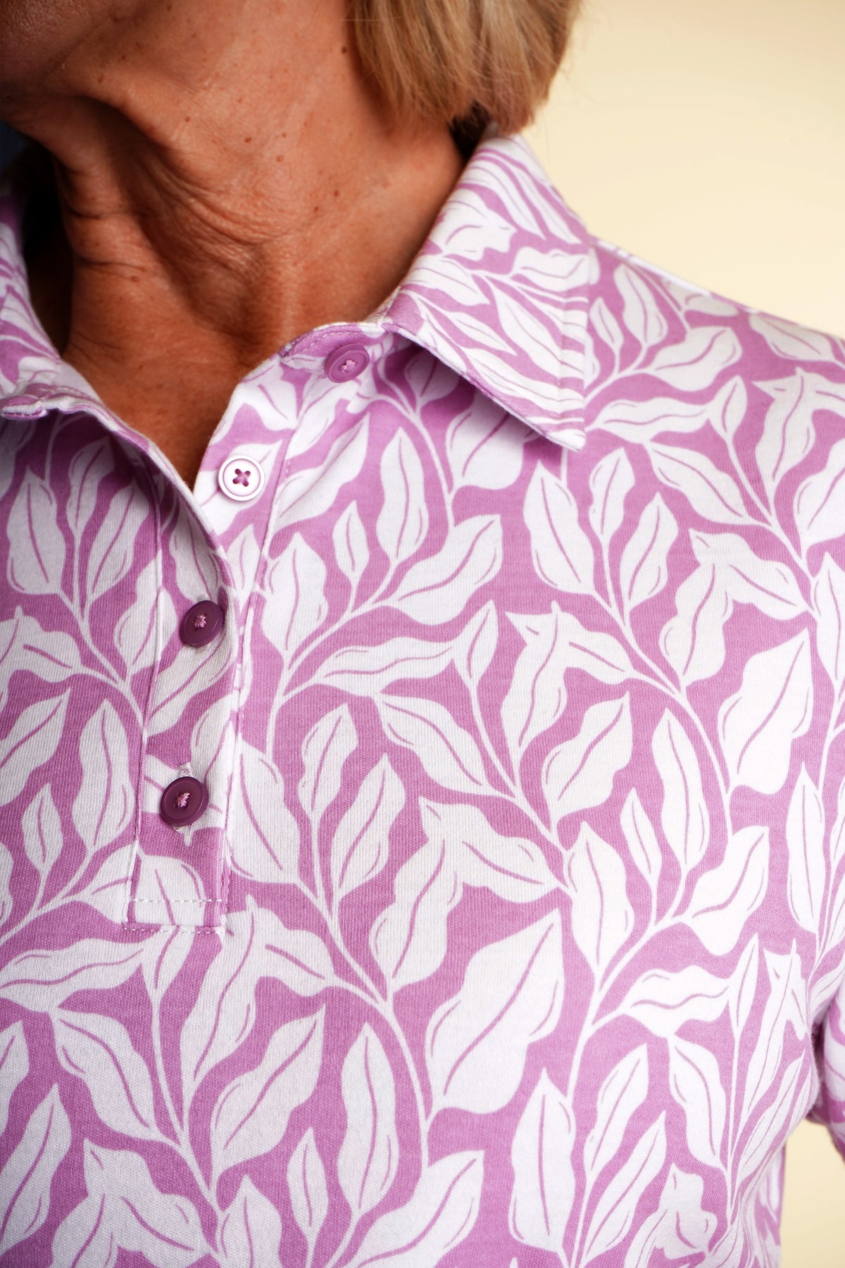 Take on the day in style with our Trailing Leaf Polo Top. Made with soft and stretchy cotton fabric, it features button fastening, short sleeves, and a vibrant all-over trailing leaf print. Perfect for adding a pop of color and pattern to any outfit. Length 23". 65% polyester, 35% cotton.