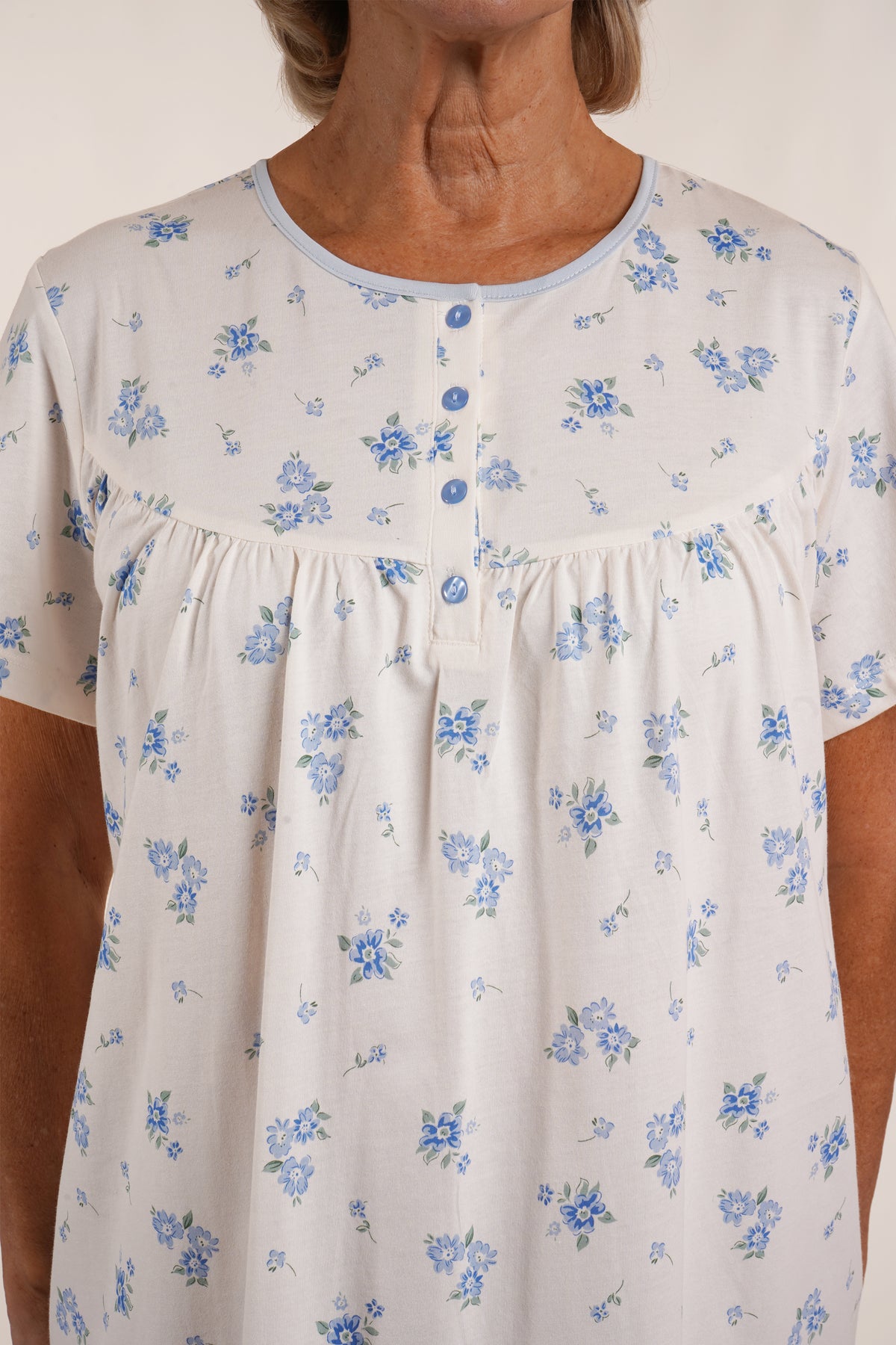 Experience ultimate comfort all night long with our Viola Nightdress. Made from soft and breathable cotton jersey, it features a curved yoke with gathering for a flattering fit. The four button fastening allows for easy wear and the short sleeve design ensures you stay cool and comfortable. 100% cotton.
