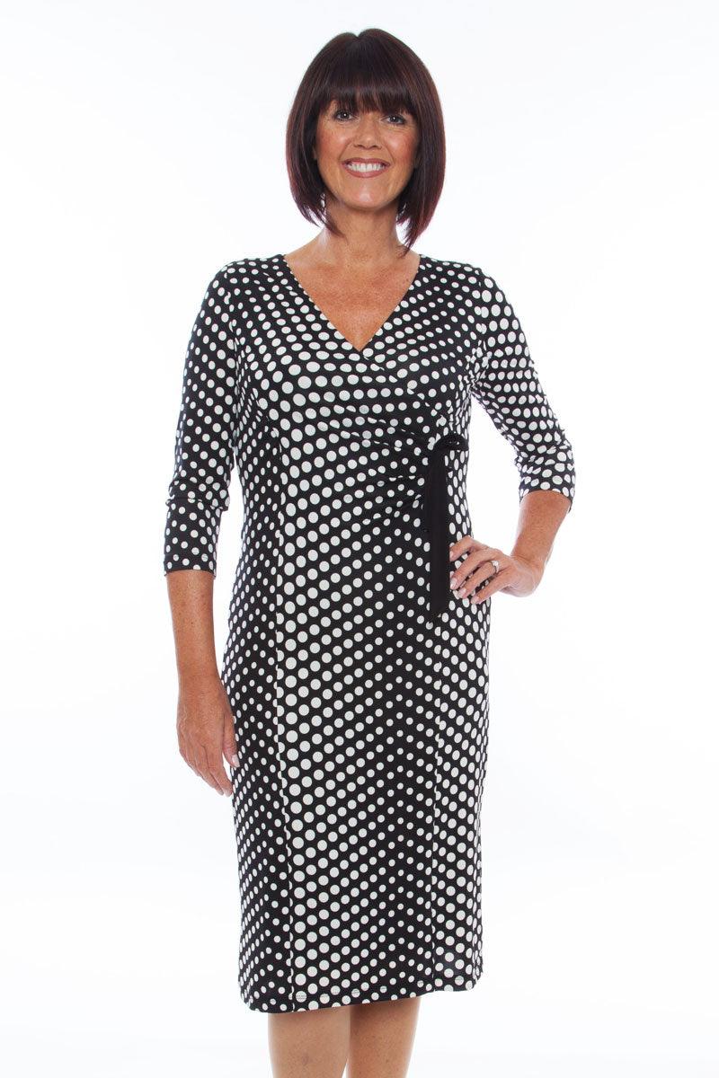 A stunning, six panel jersey dress featuring flattering fixed cross-over front panel, adorned with a contrast side tie. Fully lined, pull on style fits beautifully. Favourite three quarter sleeve. The perfect outfit for special occasions. Machine washable. 95% polyester, 5% elastane. Made by NassC.