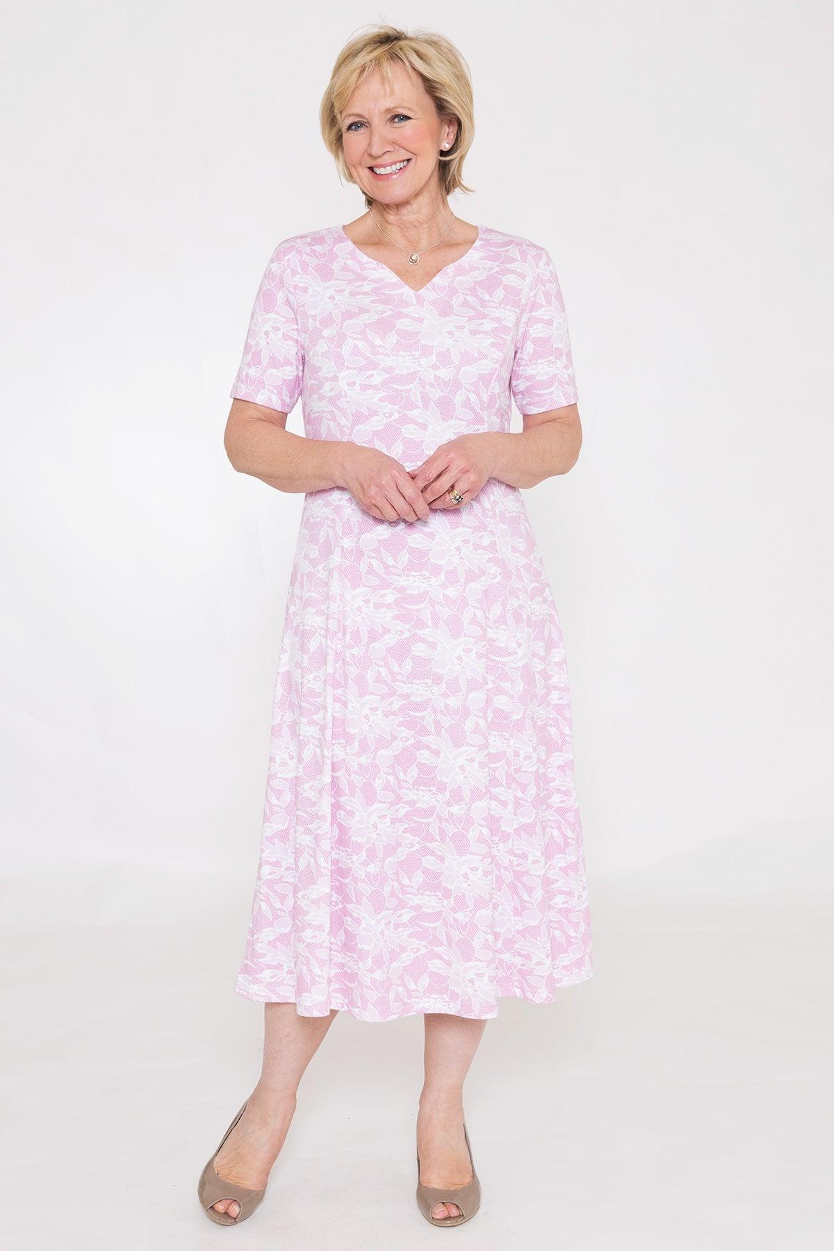 This gorgeous lace print jersey dress by Poppy features a sweetheart V neckline, slimming princess lines and short sleeves in a fitted style. Wear for seasonal occasions. Machine washable. 65% polyester, 35% cotton.