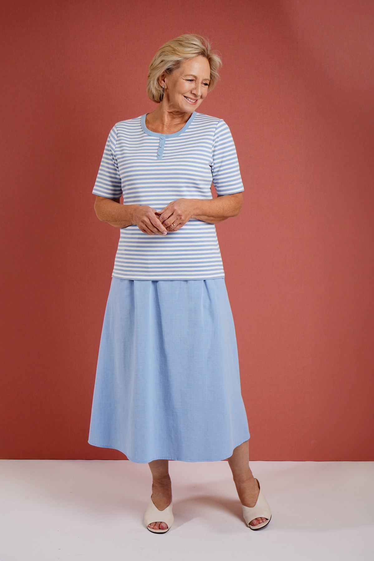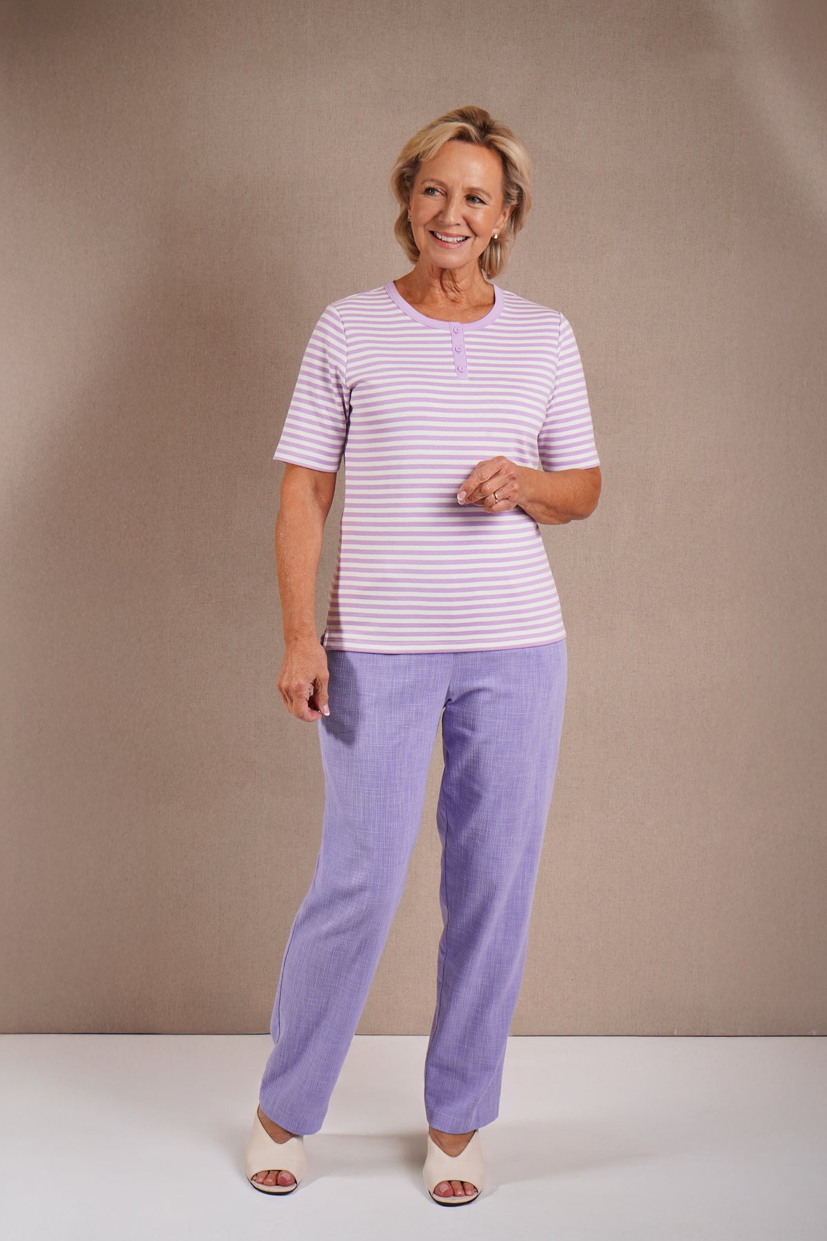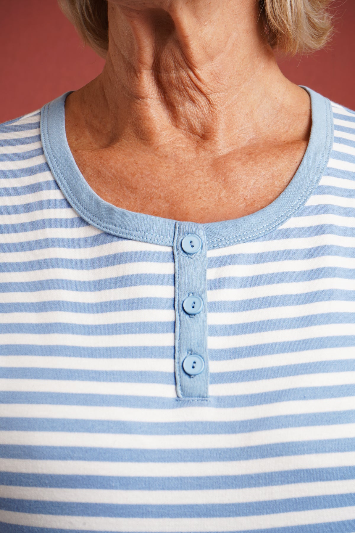 The Felix Top combines timeless style with practical design. This short-sleeved striped piece features a classic three-button placket, offering versatile layering and easy dressing. The striped pattern adds visual interest whilst maintaining a refined aesthetic suitable for both casual and smart-casual occasions. A wardrobe essential that transitions effortlessly across seasons. Back length from 24". 95% Cotton, 5% Elastane.