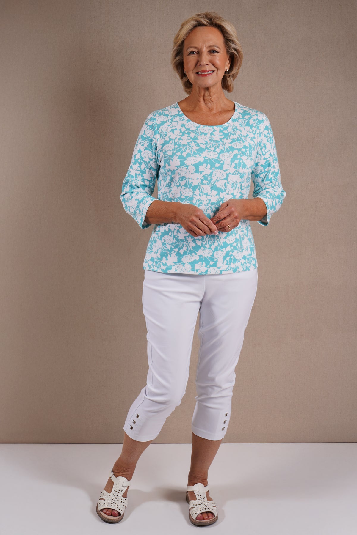 Elevate your everyday wardrobe with this sophisticated Meadow Top, featuring an all-over botanical print in striking turquoise tones. The relaxed silhouette is refined by three-quarter length sleeves and a classic round neckline, whilst practical side splits enhance movement and comfort. Perfect for layering or wearing standalone, this versatile piece transitions seamlessly from casual daywear to evening occasions. The thoughtful design details ensure both style and wearability. Back length from 23". 100% Cotton.