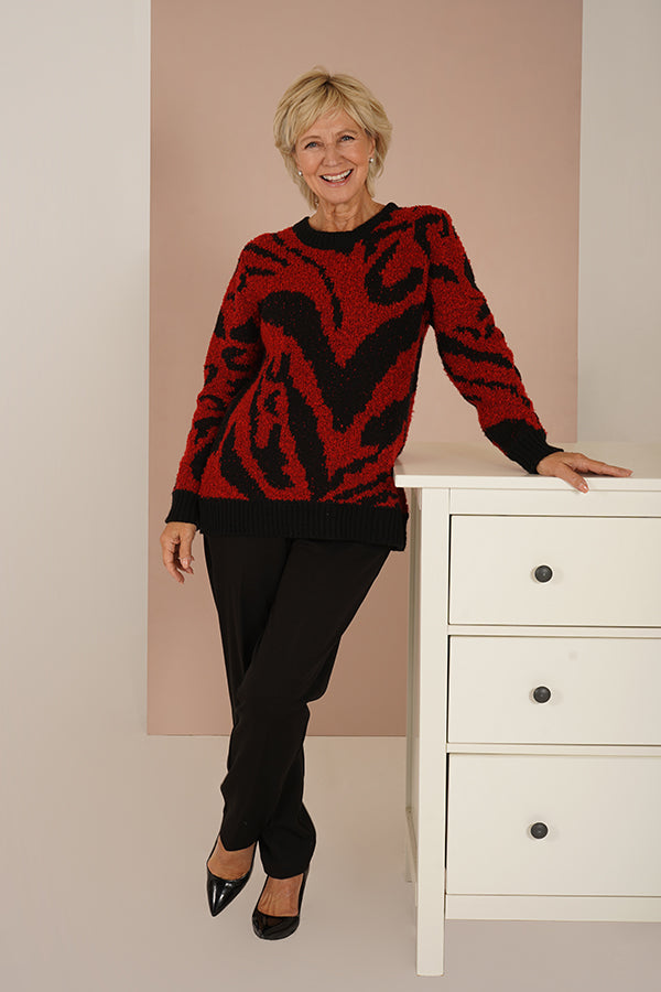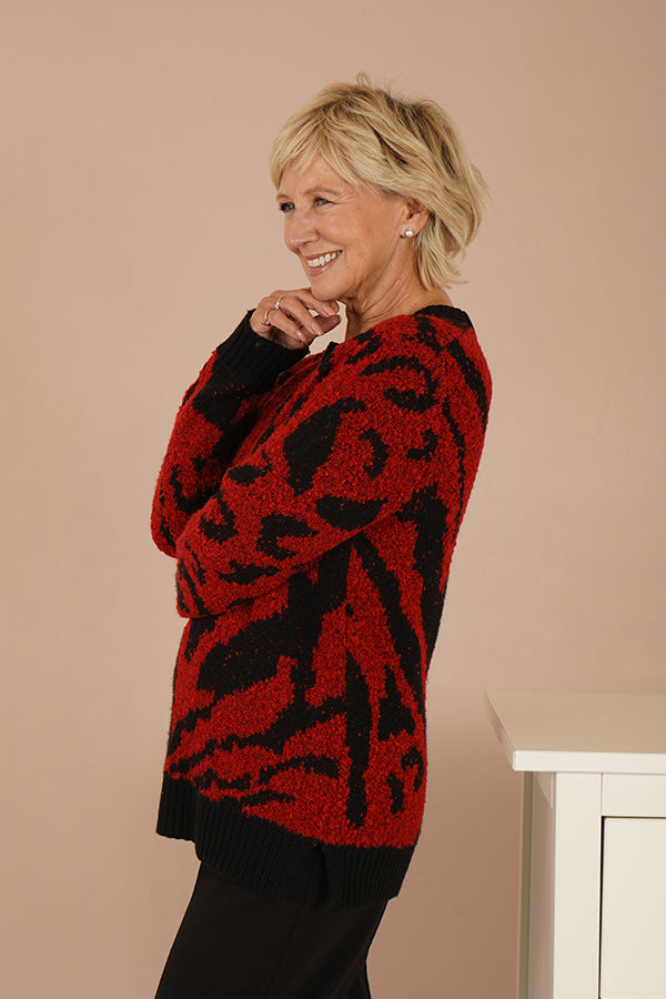 Beautiful abstract jumper with all-over safari style  print. Featuring  super soft knitted fabric with long sleeves and round shaped neckline. Finished with ribbed hem and cuffs. Back length from 26”. Machine washable at 30. 70% acrylic, 30% nylon. Made by Claudia.C.