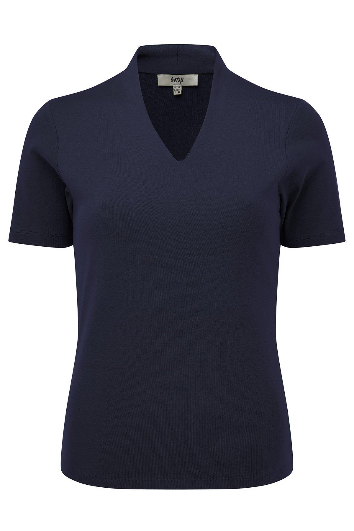 A brand new design from Betsy based on customers feedback. A wardrobe staple featuring short sleeves and a high V neck line. Back length from 23”. Machine washable. 100% cotton.