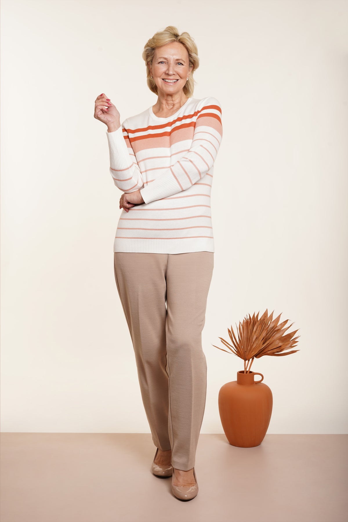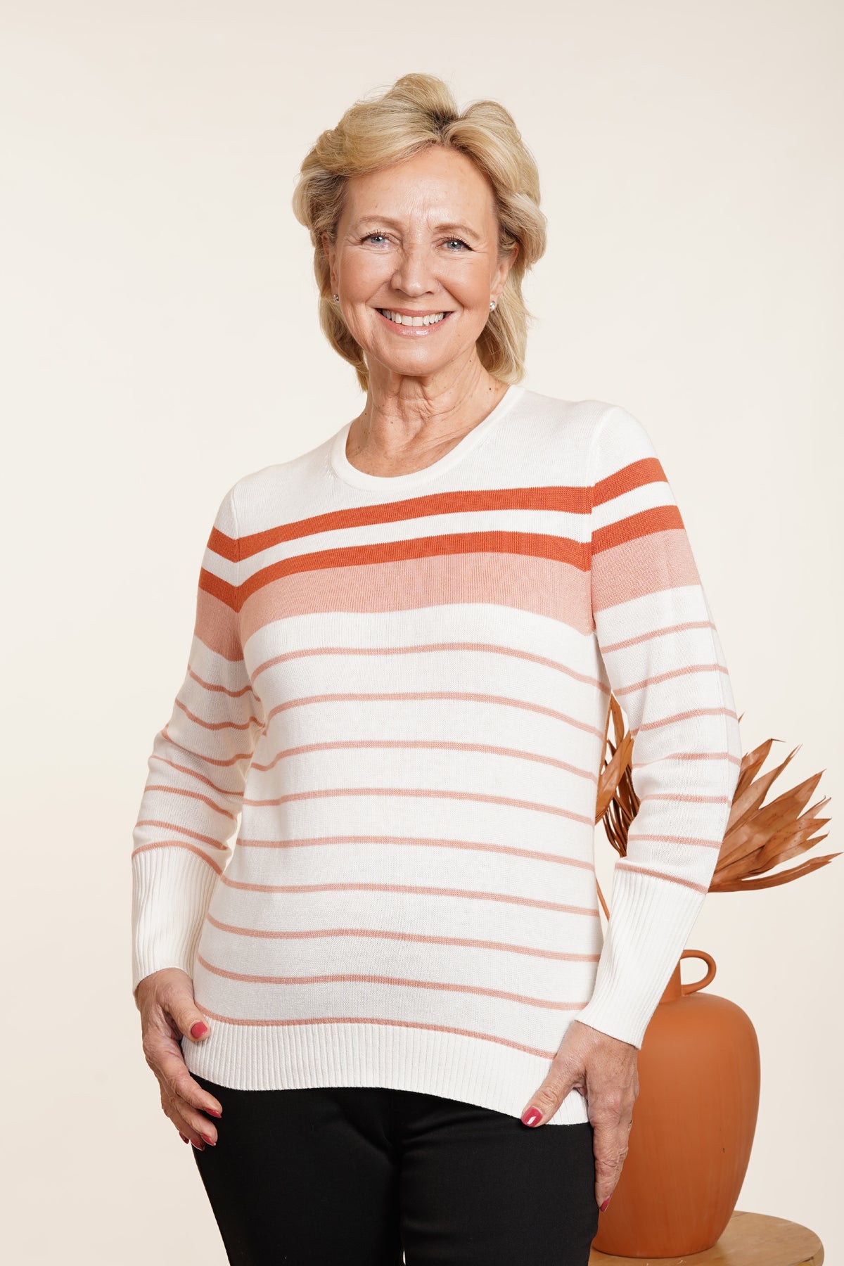 Our Round Neck Stripe Jumper is a stylish addition to any wardrobe. Crafted from a blend of soft acrylic and cotton, its long sleeves and ribbed details on the cuffs and hemline provide a sophisticated touch. Its luxurious salmon hue is complemented by a classic stripe design for timeless elegance. Back length from 23”. Machine washable at 30 degrees. 55% acrylic, 45% cotton.