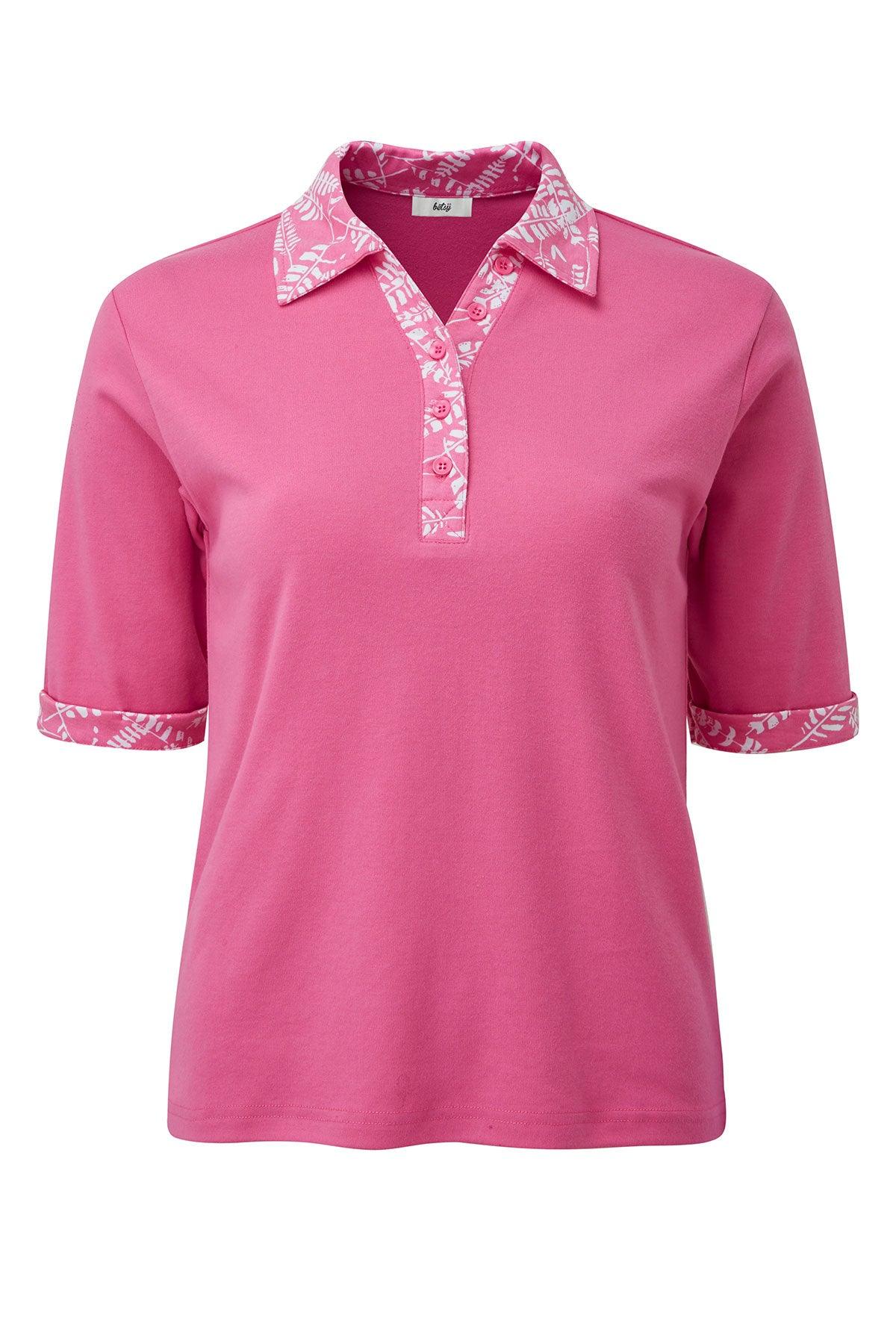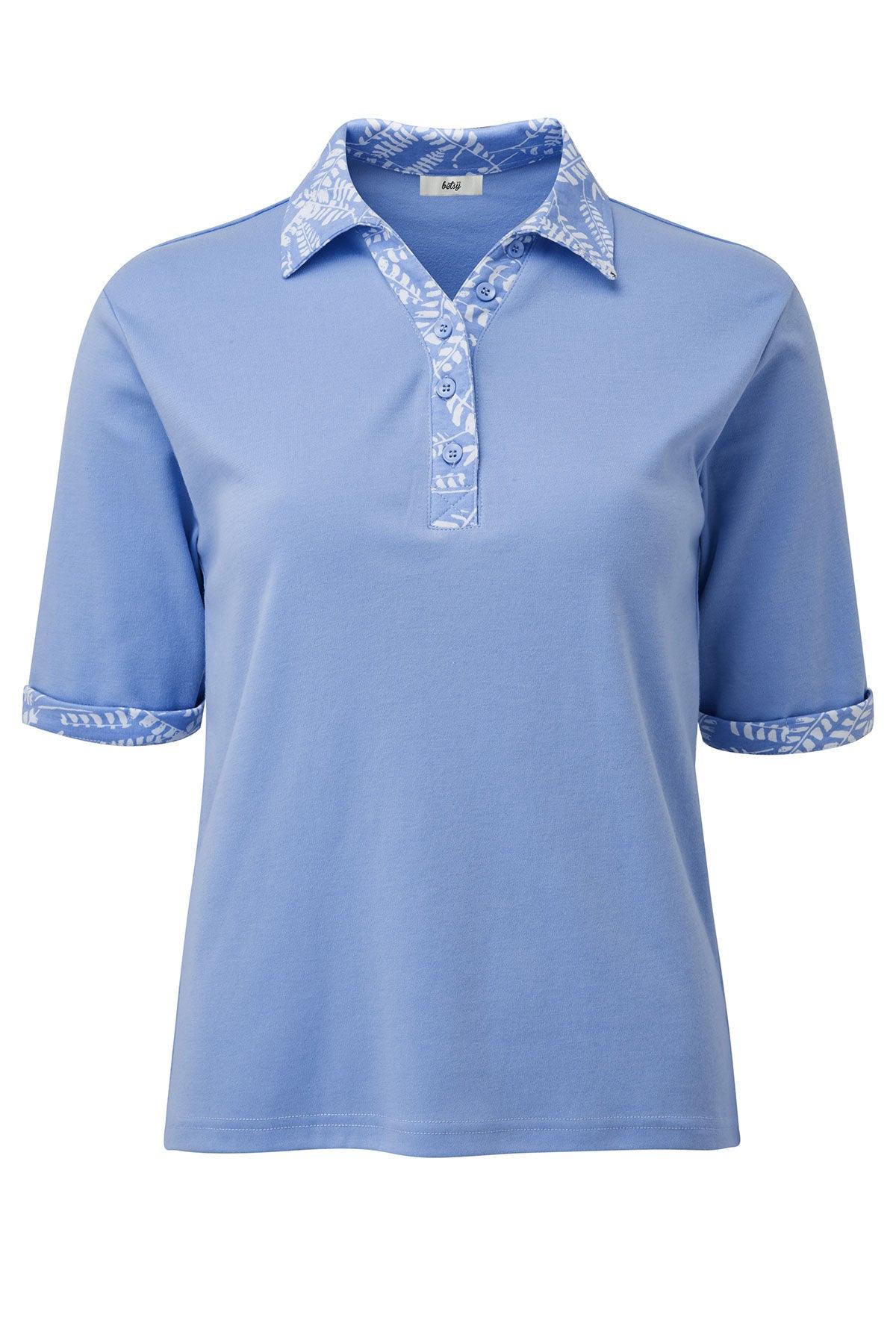 A classic, fern print jersey top from Betsy. Made from a soft easy-care fabric, with short sleeves, five button feature placket (three fastening) and turn back Revers collar. Printed design to collar, placket and sleeve cuffs. Matches the Fern Print Skirt (JB71). Back length from 23”. Machine washable. 65% polyester, 35% cotton.