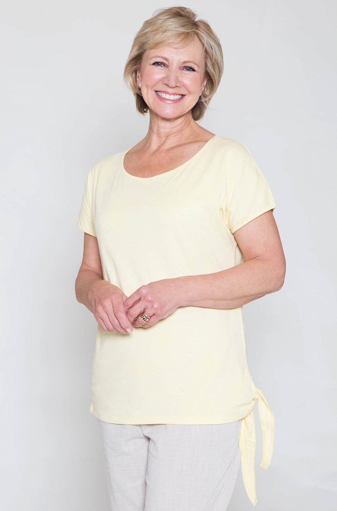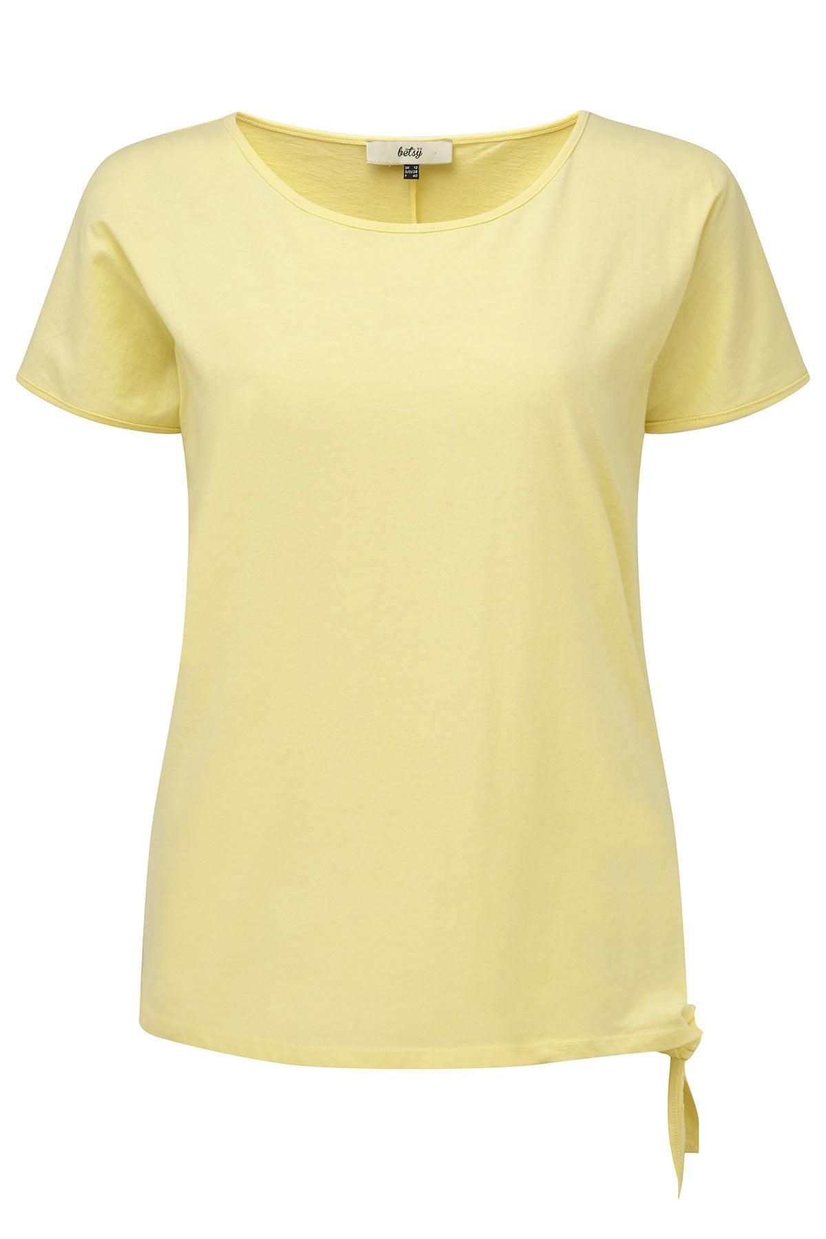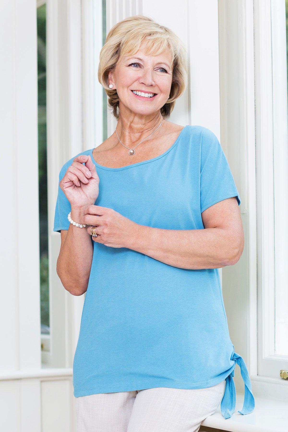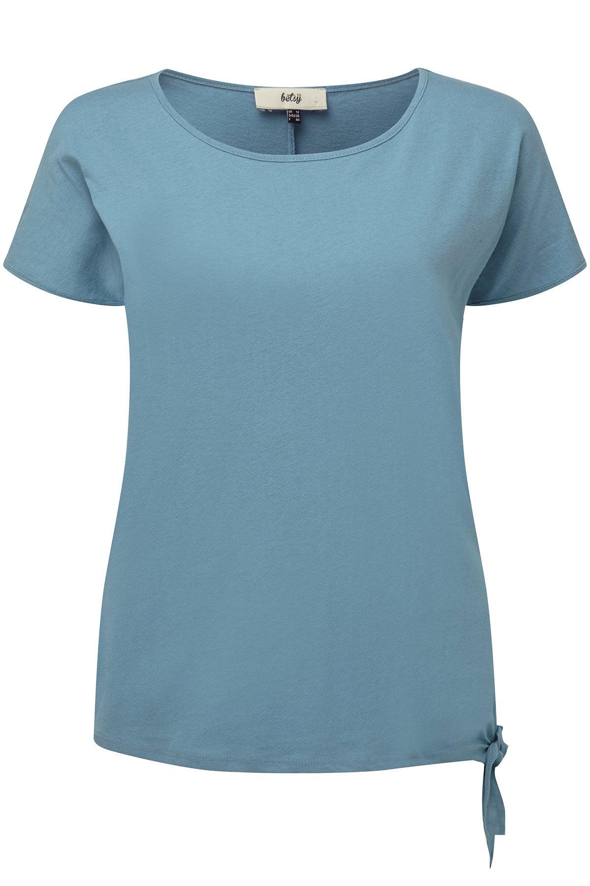 A youthful, boat neckline jersey top by Betsy. Its loose fitting style and light fabric makes it a great option for warmer weather. Includes flattering side-tie hem feature. Cap sleeves and mid back seam. Back length from 24 inch. Machine washable. 100% single jersey cotton.