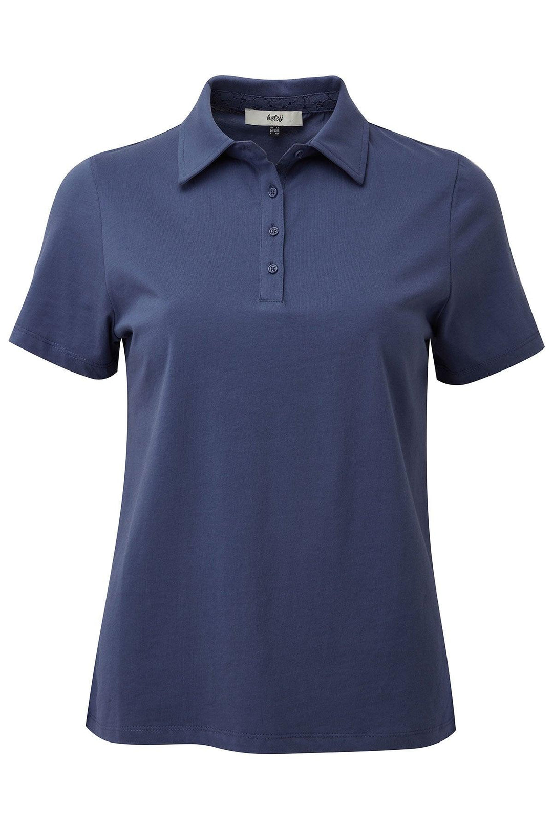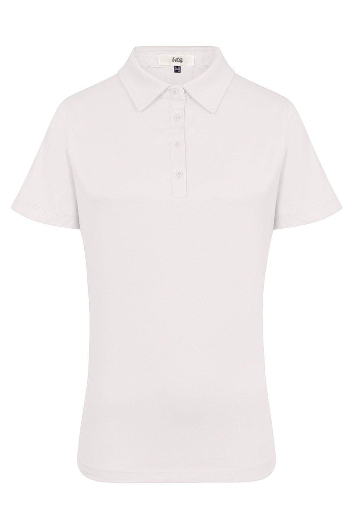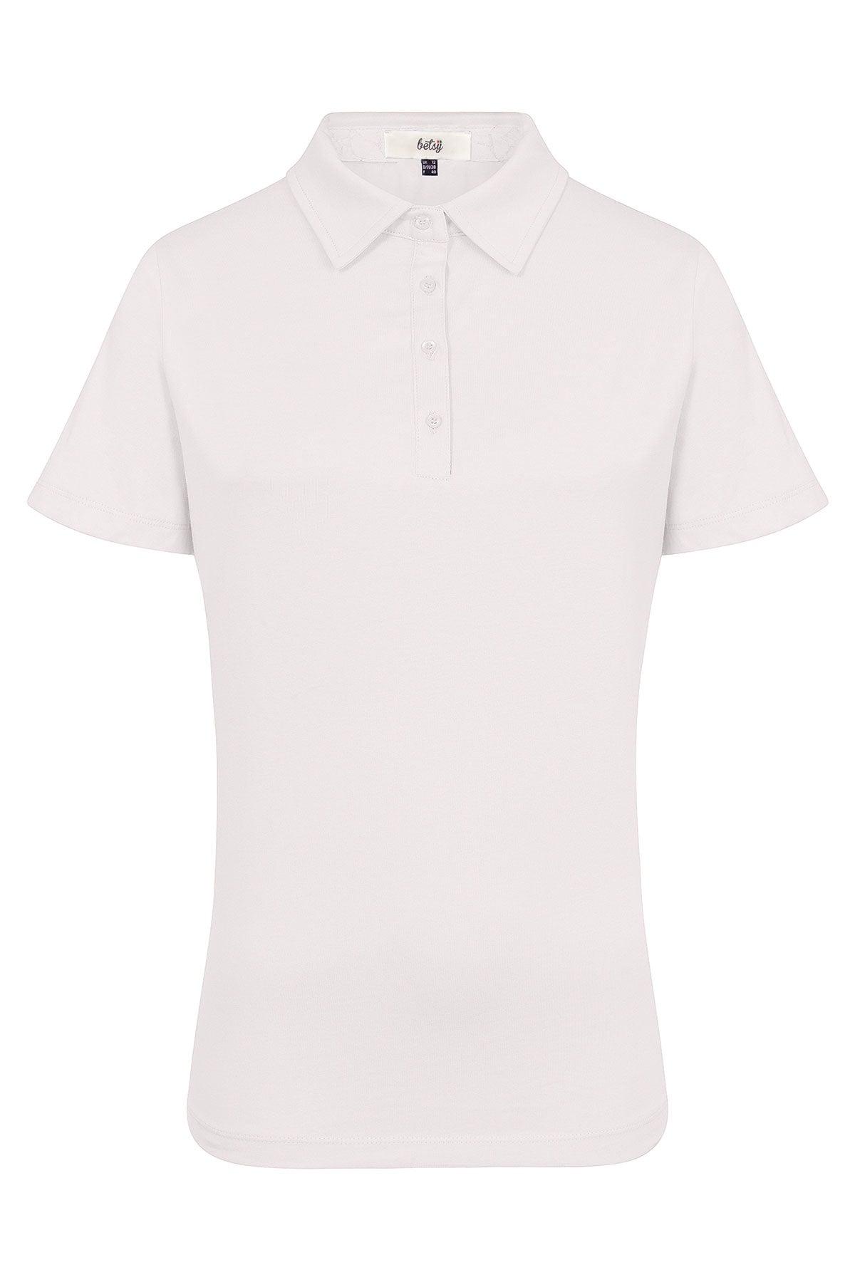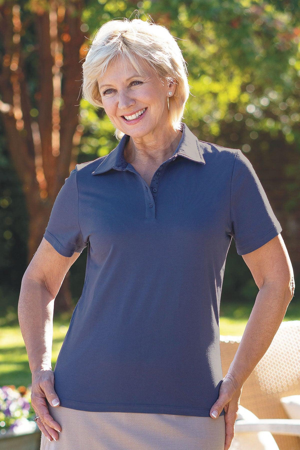 A summer-ready, collared top by Betsy. Features feminine lace trim to 4 button placket and inner collar. Short sleeves. Back length from 25". Machine washable. 100% cotton.
