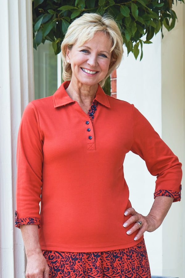 Soft jersey Collar top from Betsy. Features printed detail on the sleeve cuff, collar reverse and placket facing. Five button detail, three of which fasten and two button sleeve tab. Back length from 23”. Machine washable. 65% polyester, 35% cotton.