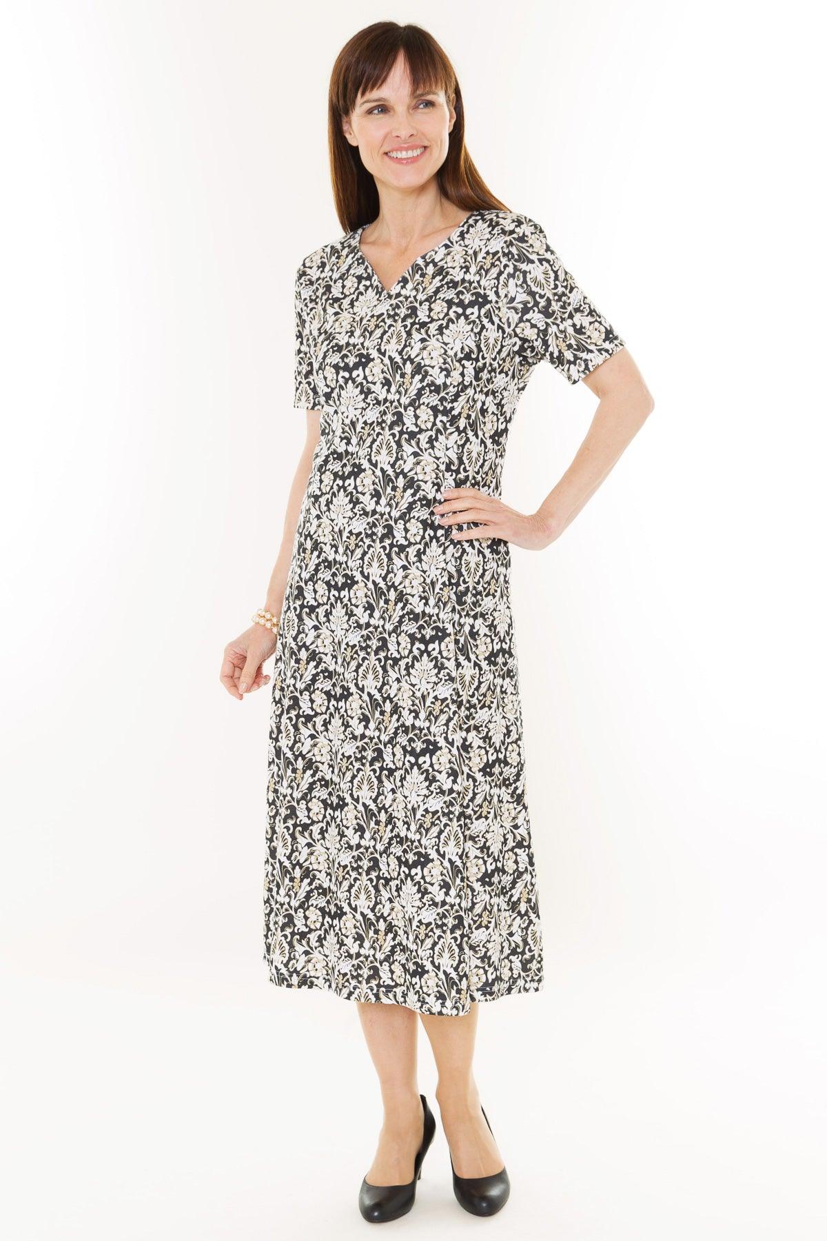 All over abstract print, soft V neck dress by Betsy. Cut with princess lines with stylish six panel skirt (no waist seam). Short inset sleeves that finish just above the elbow. Layer up with a choice of cardigans from the Spring collection. Machine washable. 65% polyester, 35% cotton.