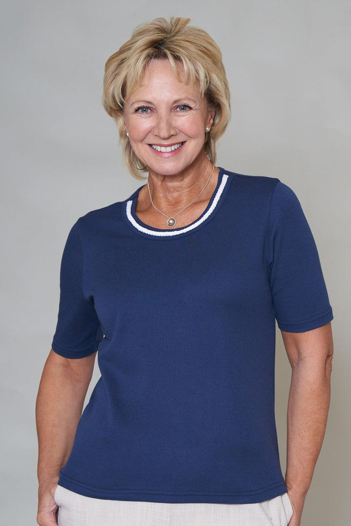 An original, short-sleeved jersey top by Betsy. Features a fancy, twisted cord insert around a scoop neckline for a feminine flare. Short sleeves make it a simple, yet stylish everyday tee. Colours coordinate with Swirl Leaf Skirt (JB27) and other Betsy separates. Back length from 23 inch. Machine washable. 65% poly, 35% cotton.