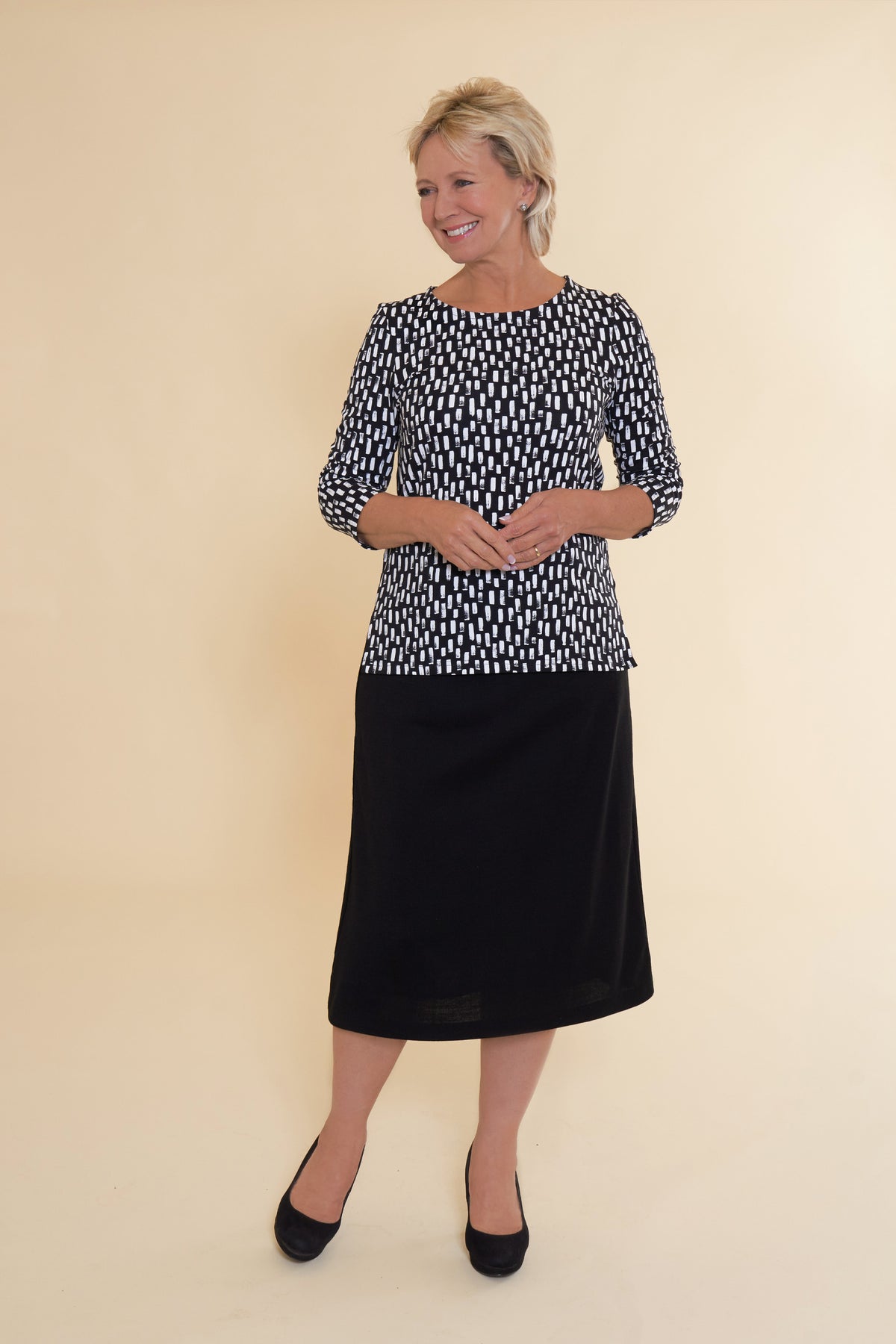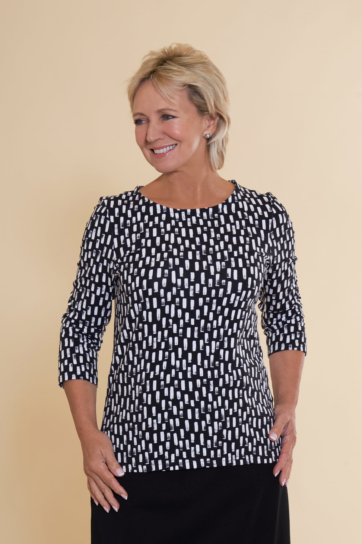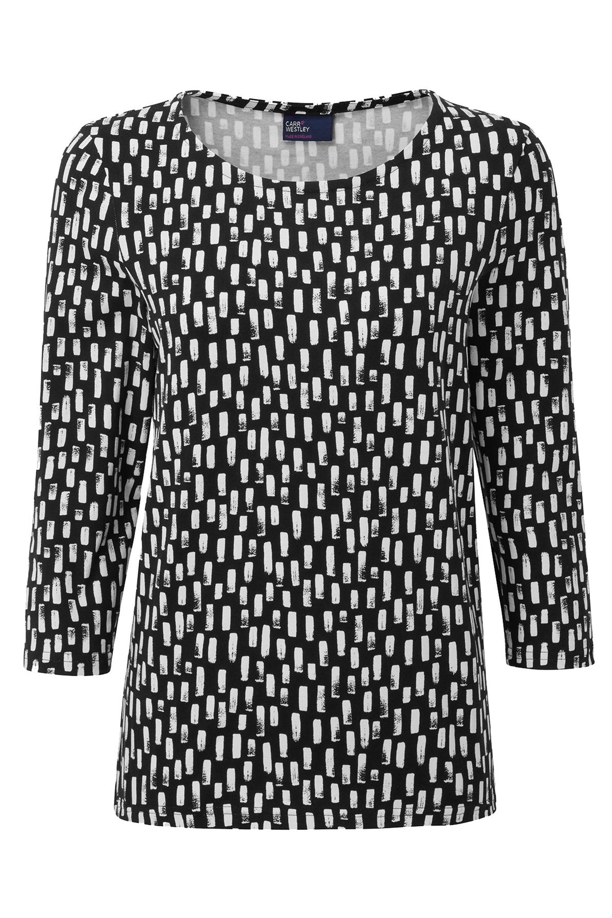 Pure cotton jersey top with a little stretch makes a luxury item, to wash and wear all throughout the Summer. Styled with round neck, three-quarter length sleeves and side slits for a comfy fit at the hips. Back length from 23”. Machine washable. 95% cotton, 5% elastane.