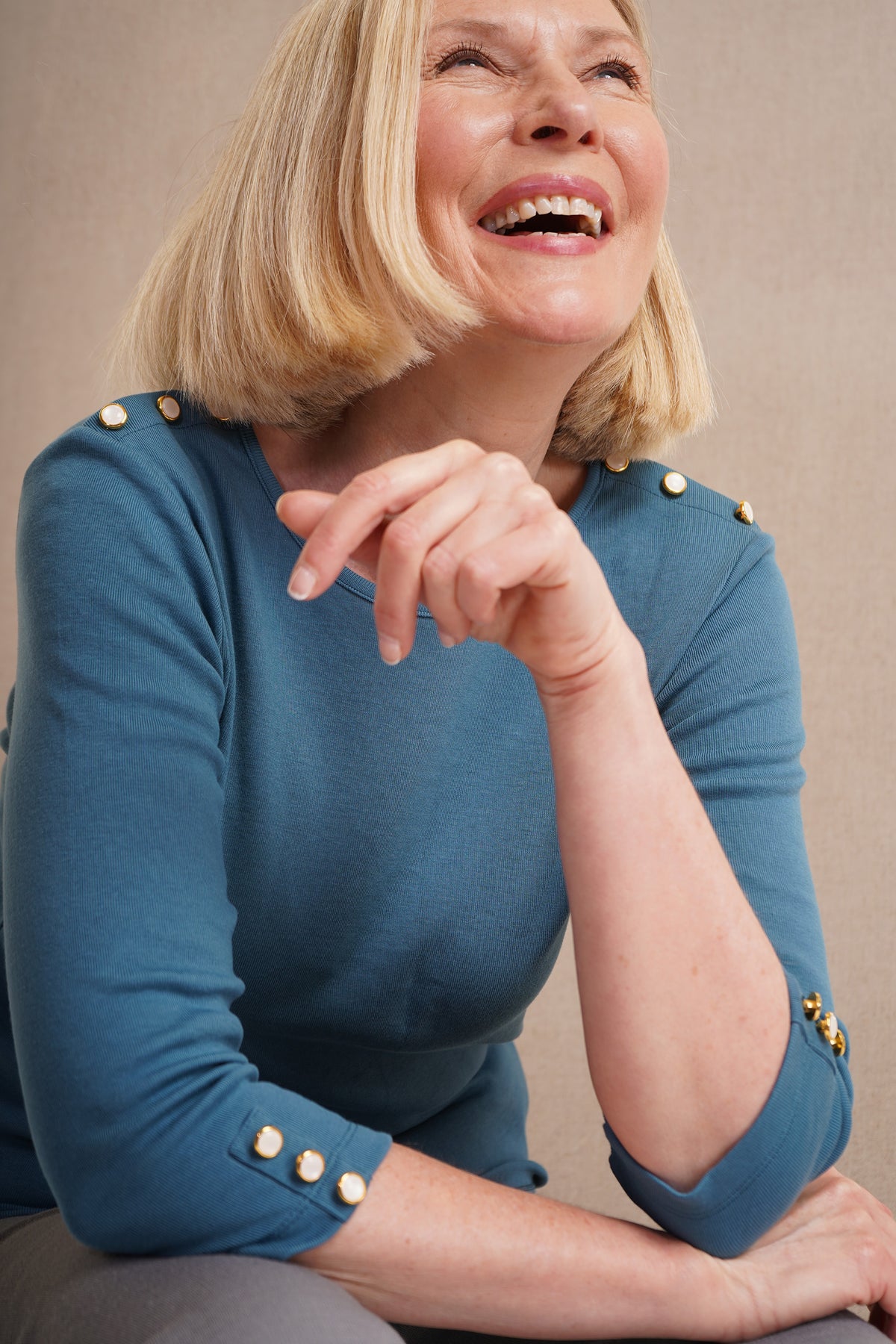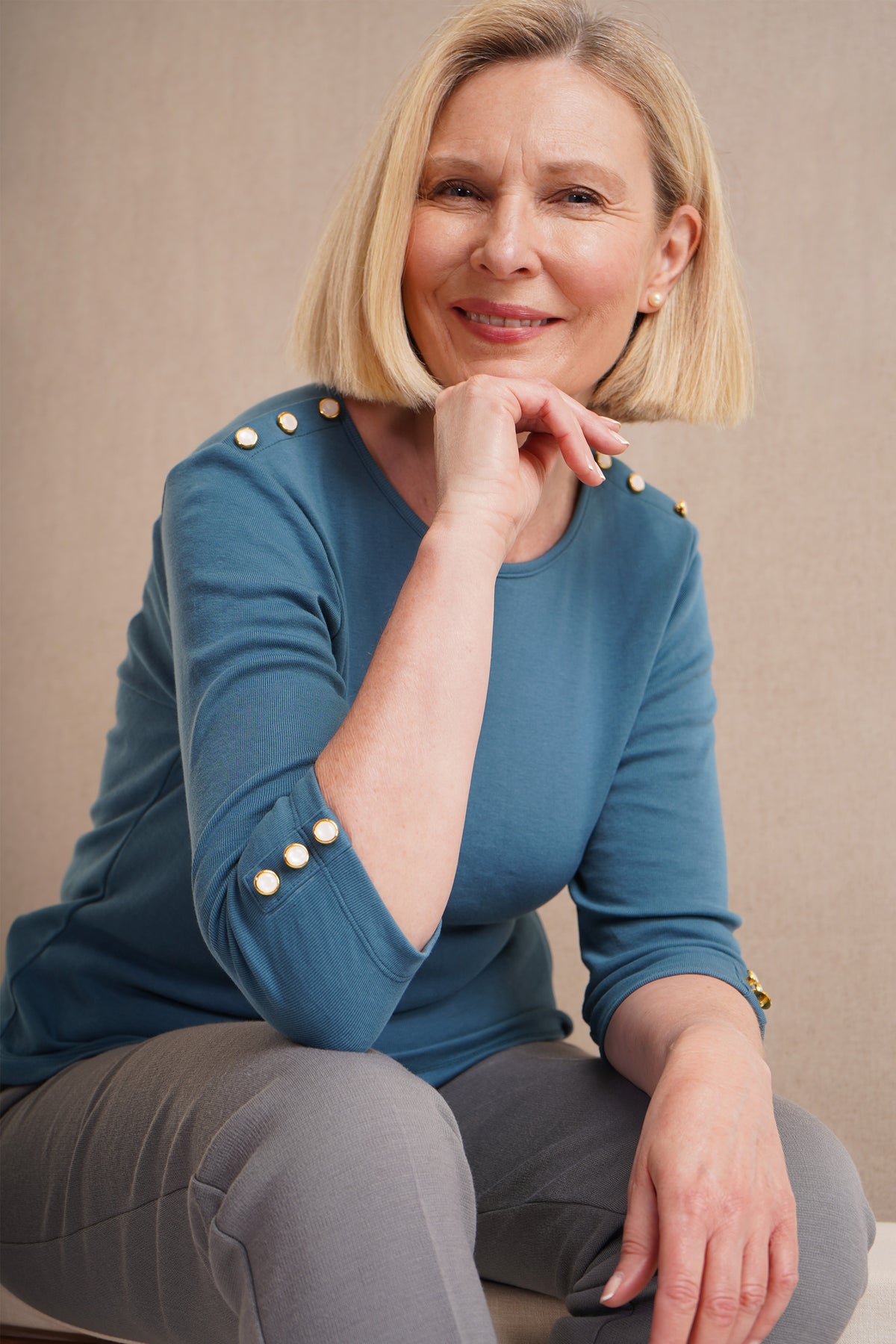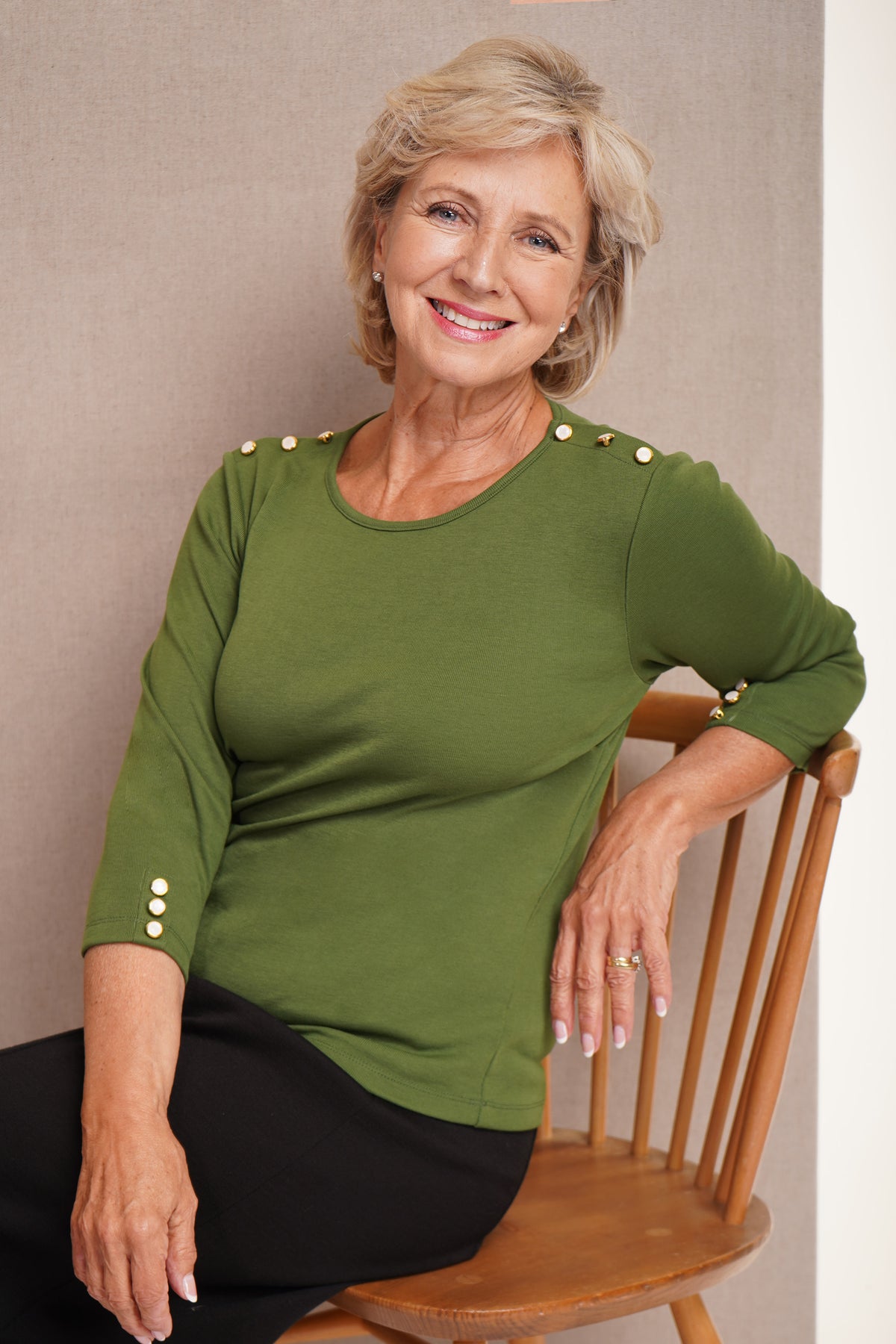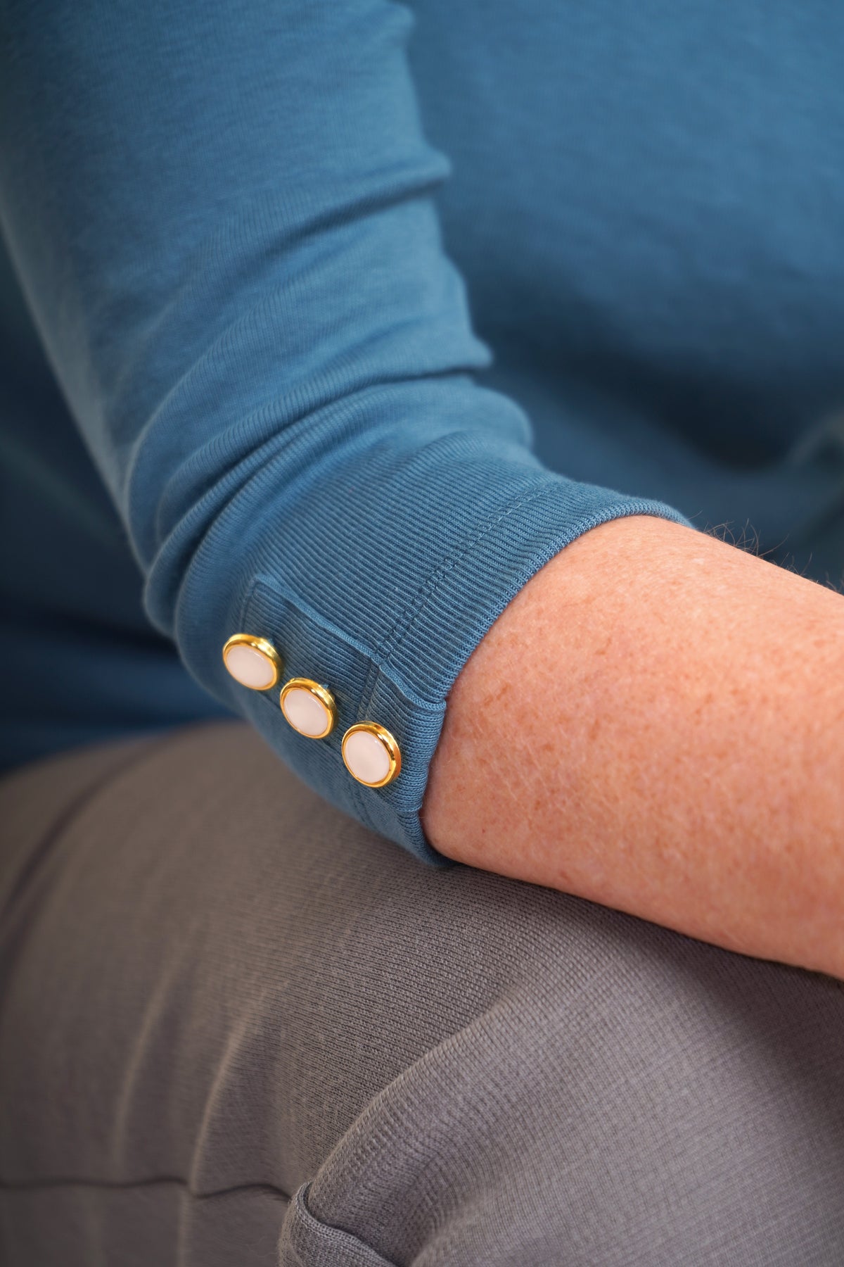 This stylish top showcases a sophisticated design, with decorative gold buttons along the shoulders and cuffs. Pair with jeans for a casual look or dressed up with a skirt for a more polished ensemble. Features a round neckline and ¾ length sleeves. 65% polyester, 35% cotton. Made by Poppy.