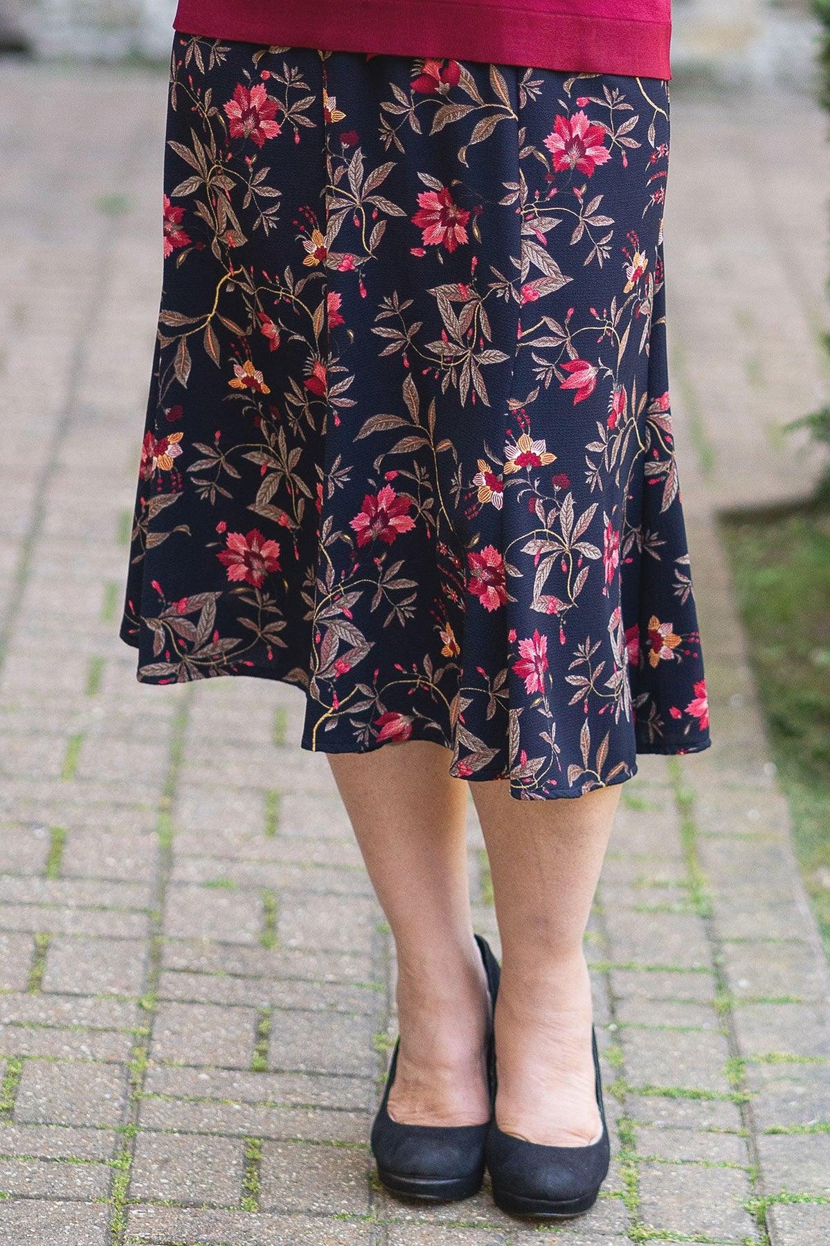 Warm Autumnal colours make a stunning easy wear skirt. Easy care crepe handle fabric will wash and wear like a dream, needing no ironing. Elegant six fluted panels, elasticated waist band and comfort lining. Machine washable. 90% polyester, 10% wool.