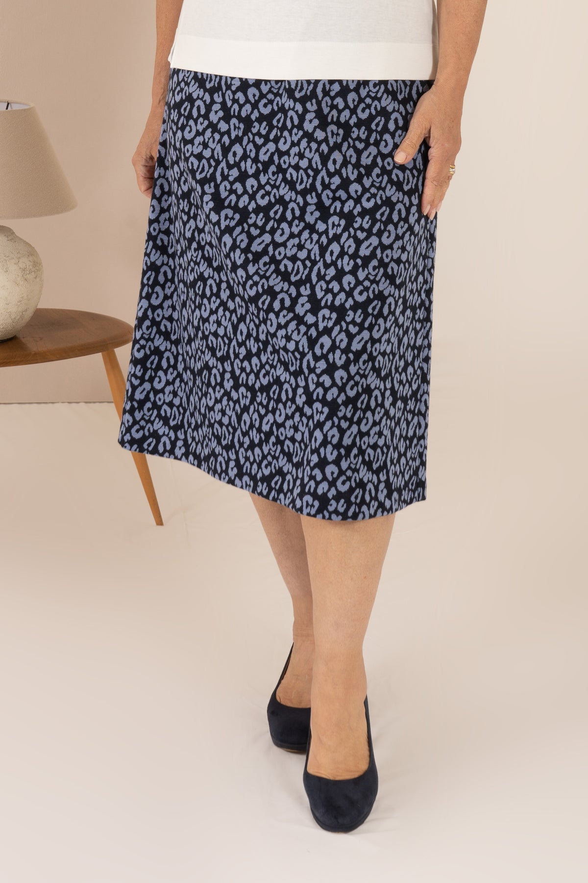 A contemporary skirt crafted in a lightweight jacquard jersey material, lovingly made to order by our team of seamstresses at Bourne Mill. Cut in a two panel design, with one concealed side pocket, an easy stretch waistband and full lining. Stay comfortably chic with the subtle yet stylish leopard print design. Machine washable at 30. 80% acrylic, 19% polyester, 1% elastane. Lining 100% polyester. Made by Carr & Westley.