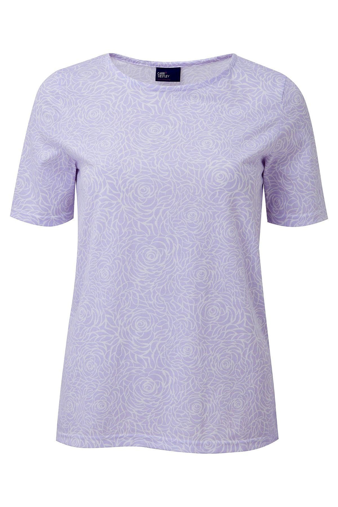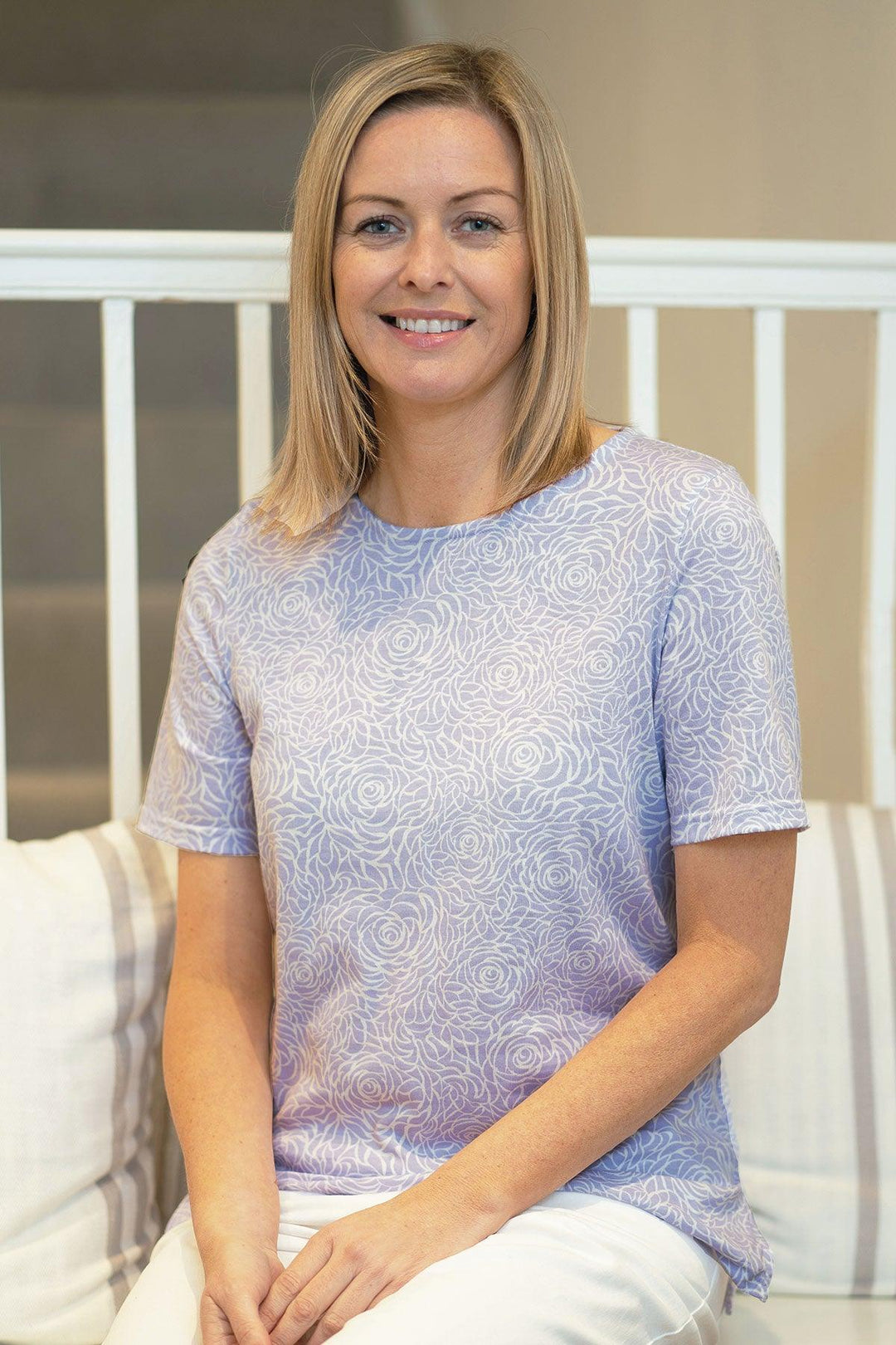 Beautiful Austrian mercerised cotton jersey is used for this splendid top. Made in C&W’s workrooms with short sleeves, side splits and round neck line. Crisp etched rose pattern. Matches the Rose Print Skirt (S512). Back length from 25“. Machine washable. 100% cotton jersey.