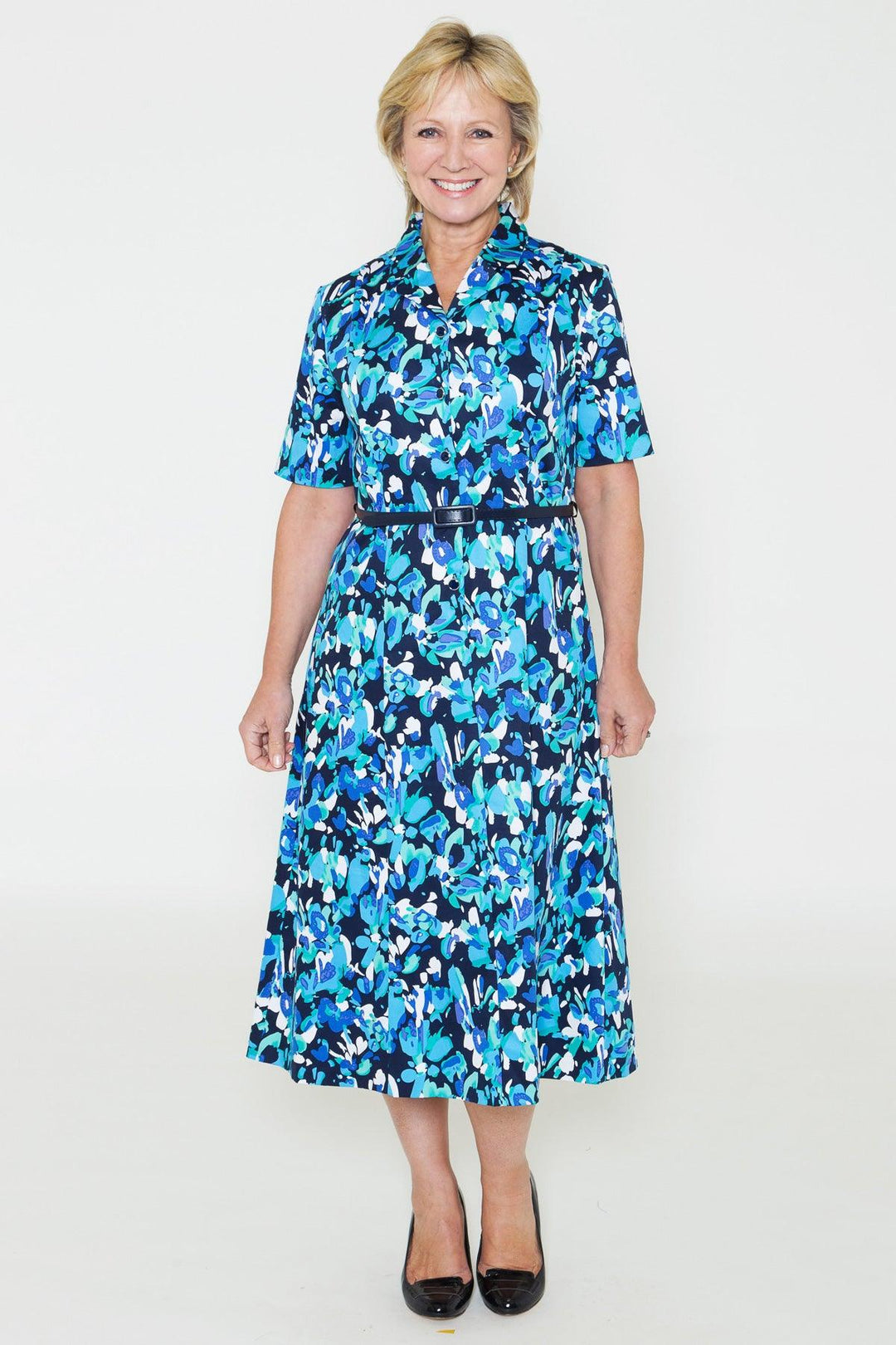 Limited-edition, jardin cotton dress by Carr & Westley. Designed with a little stretch for added comfort, it's cut in a princess line shape, with revers collar and seamless back. Short sleeves and three quarter button through front. Includes concealed side pocket, navy buttons and matching belt. Improved fit. Machine washable. 97% cotton, 3% spandex.