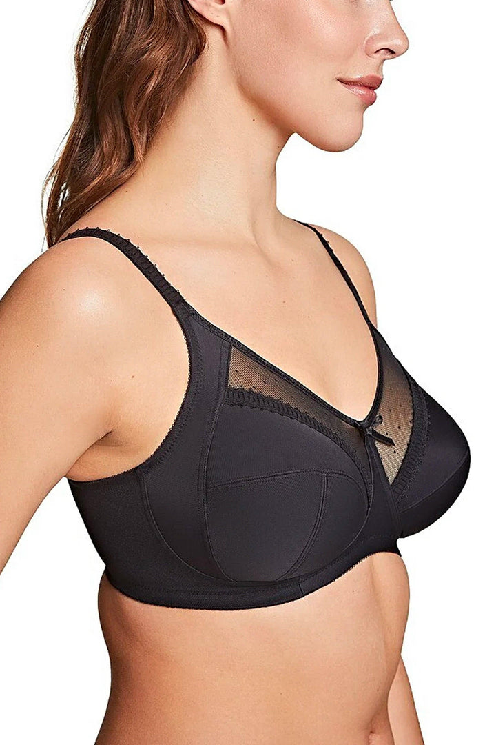 Fantastic, firm support, excellent comfort and a great shape make Charlotte one of our best-selling wirefree styles. With mesh top cup for a lighter look and additional side sling in cup sizes DD-L (E-L in Blush) for extra support, Charlotte comes in four essential colours. 50% Polyamide, 38% Cotton, 7% Polyester, 5% Elastane. Made by Royce Lingerie.