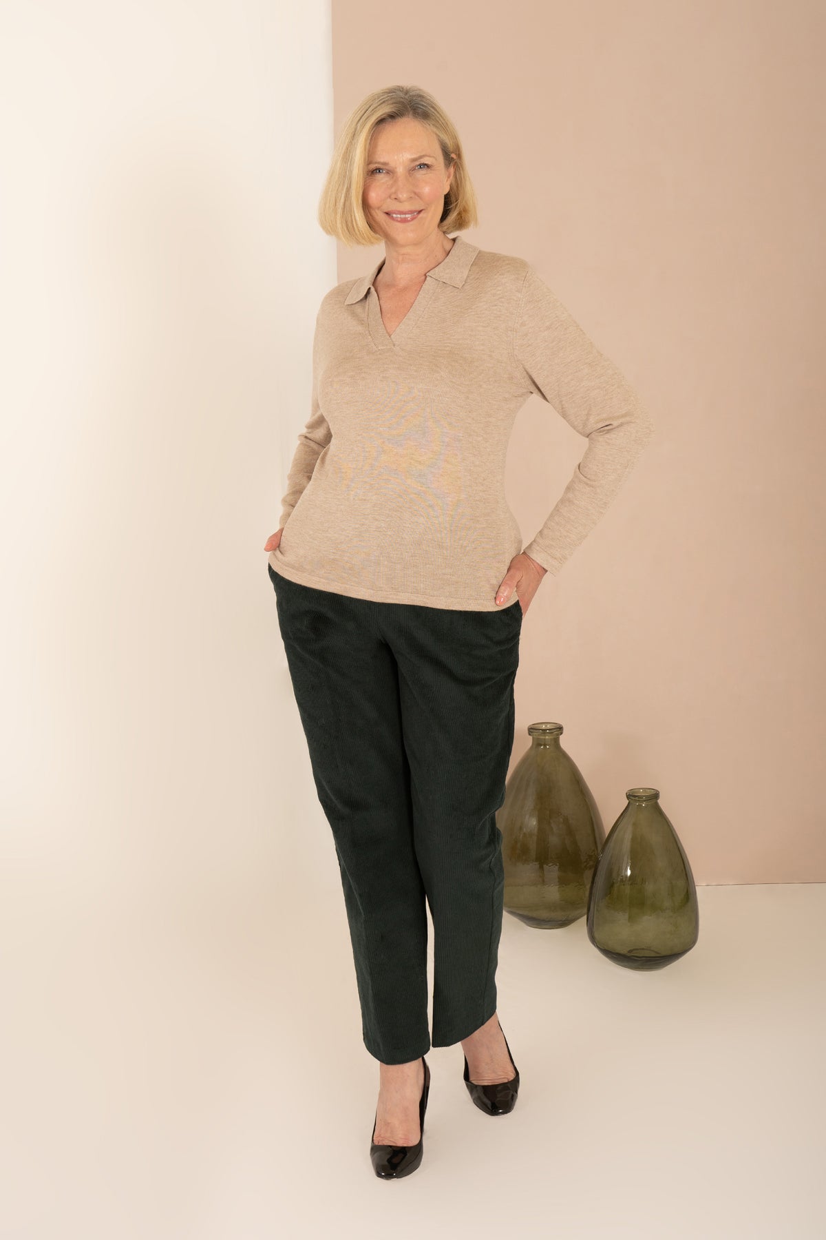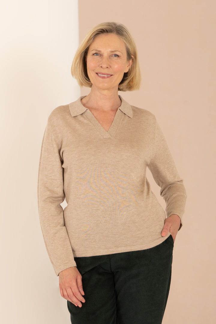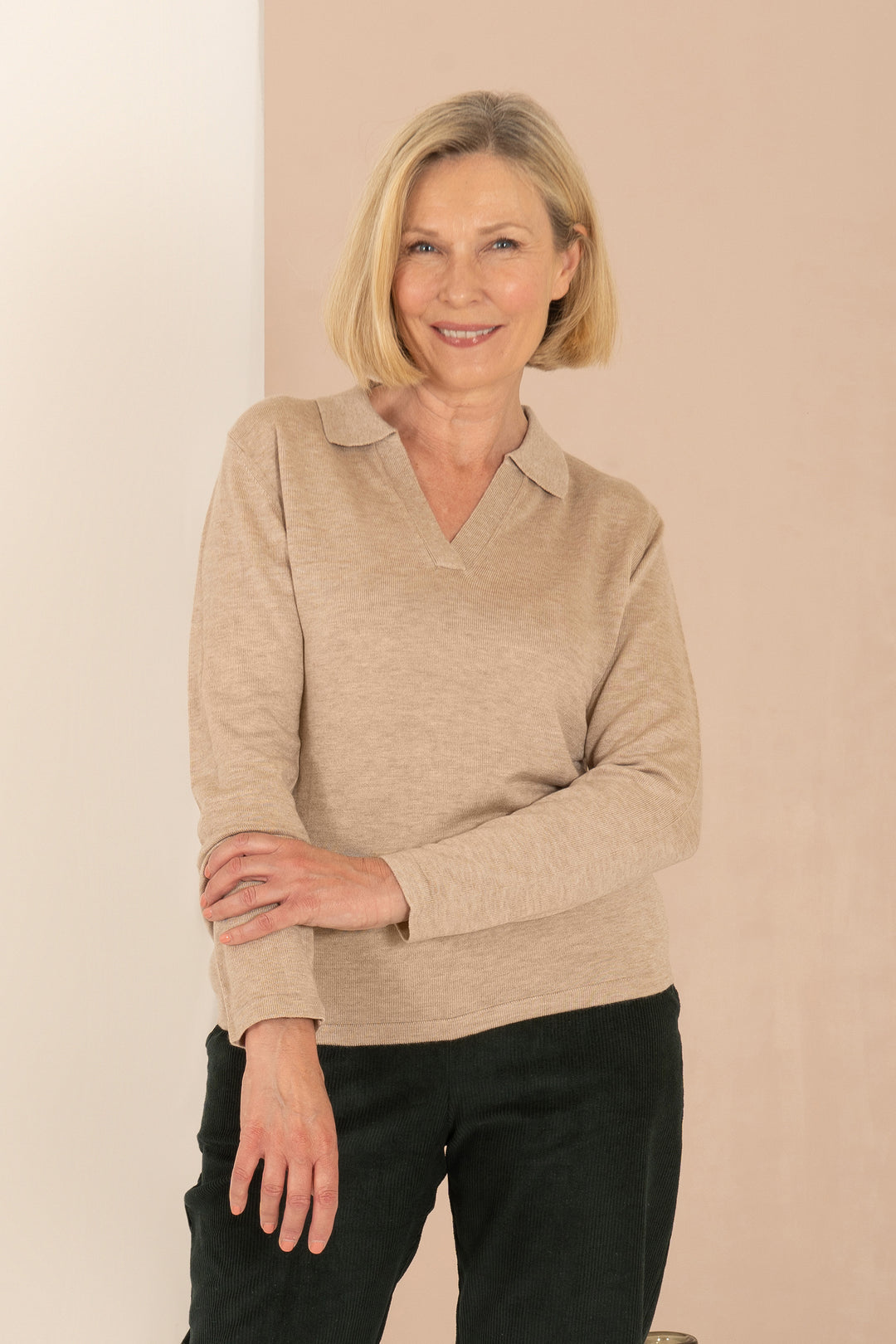 Gorgeous knitted polo to give your wardrobe timeless style. Featuring long sleeves, an open placket and classic collar. Finished with tubular trims. Back length from 24”. 54% polyester, 20% acrylic, 20% nylon, 6% wool. Machine washable at 30 degrees. Made by Poppy.