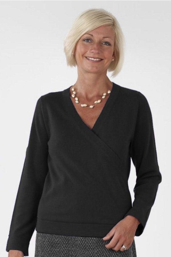 Popular cross over style jumper by Poppy. Features v neck design with semi raglan sleeves for a classy fit. Made from a fine knit wool mix it has a picot edge trim. Wear with a camisole underneath for a modern twist. Back length 22 inch. Machine washable. 50% lambswool, 50% acrylic.