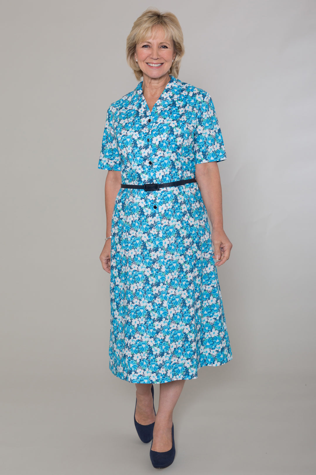 A smart, princess line dress from C&W’s design team. Features a pretty daisy cluster print, Revers collar style and neat body shaping. Elbow length sleeves and three quarter button through front. Easy wear, over the head style. Optional patent belt. Machine washable.