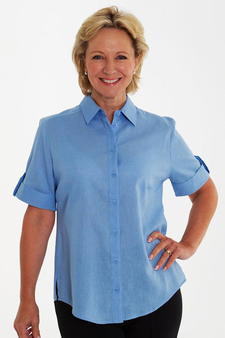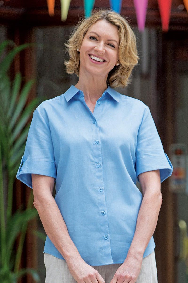Linen rich blouse with tab detail short sleeve by Double Two. Back yoke with pleat and button detail. Curved hem and side splits, ideal worn over trousers, skirts or tucked in. Machine washable. 55% linen, 45% cotton. Back length from 26".