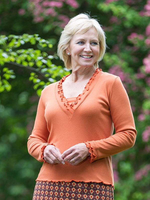 New, charming ruffle trim top by Emreco in easy care poly cotton jersey. Featuring V neckline with modesty inset, long sleeves and contrast edging to cuff and hem. Back length 23". Machine washable. 65% polyester, 35% cotton.
