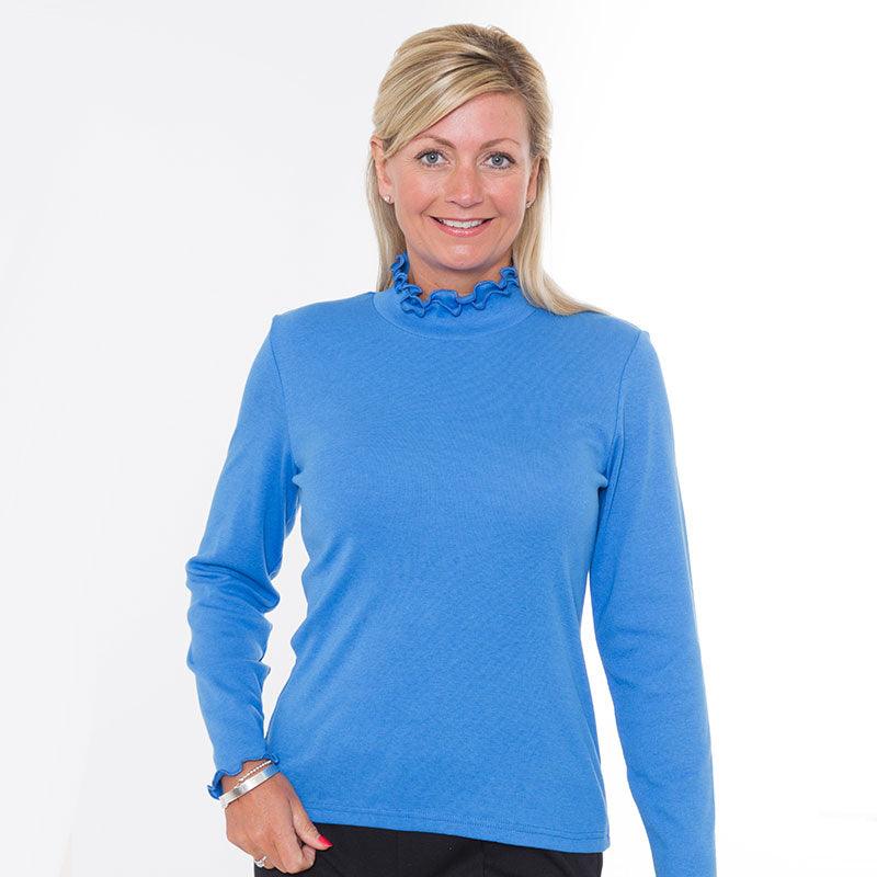Stylish, ruffle trim polo neck top by Emreco. Made from an easy care jersey, it features a gorgeous contemporary polo neck, long sleeves and contrast edging to the cuffs and hem. Machine washable at 30 degrees. 65% poly, 35% cotton.