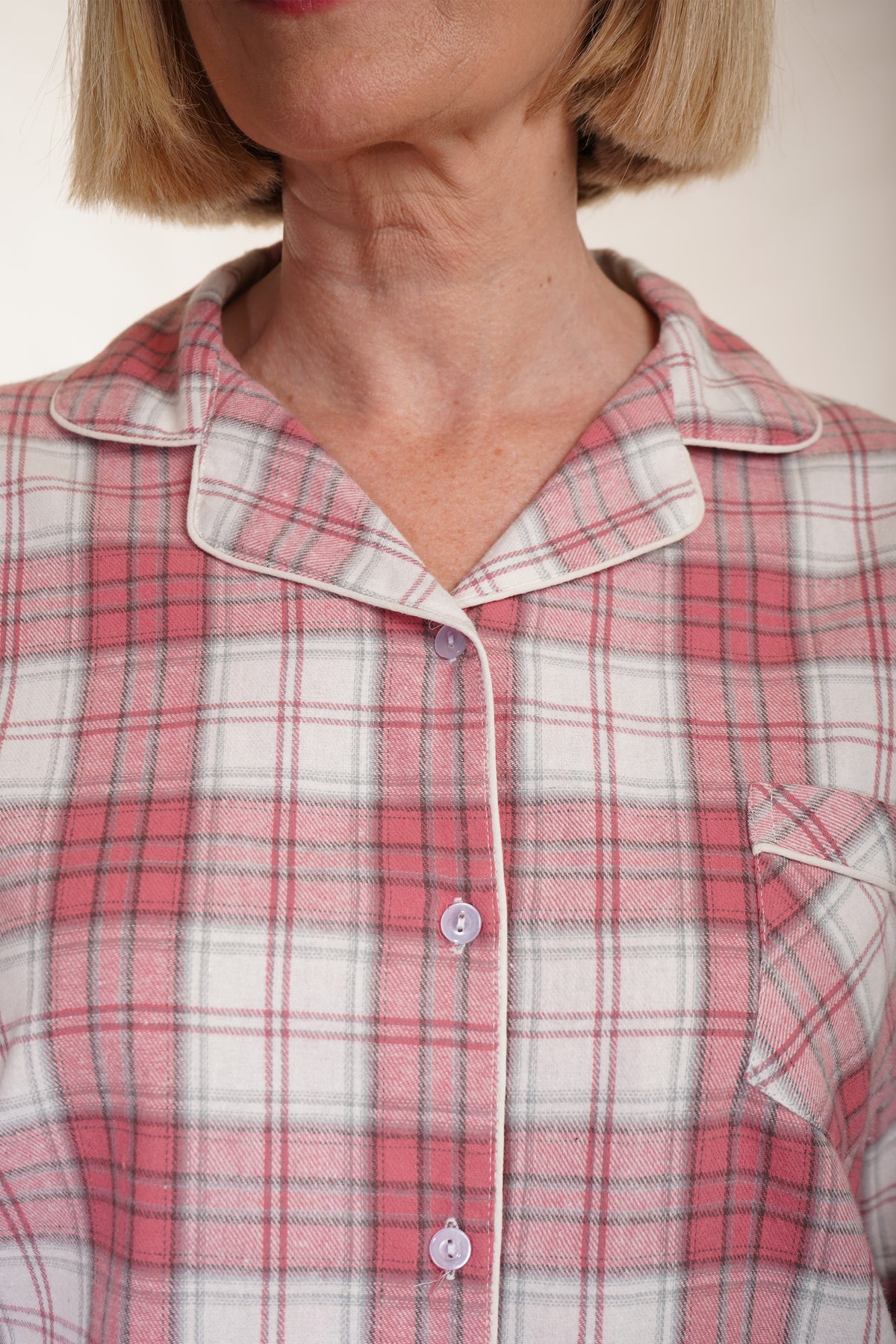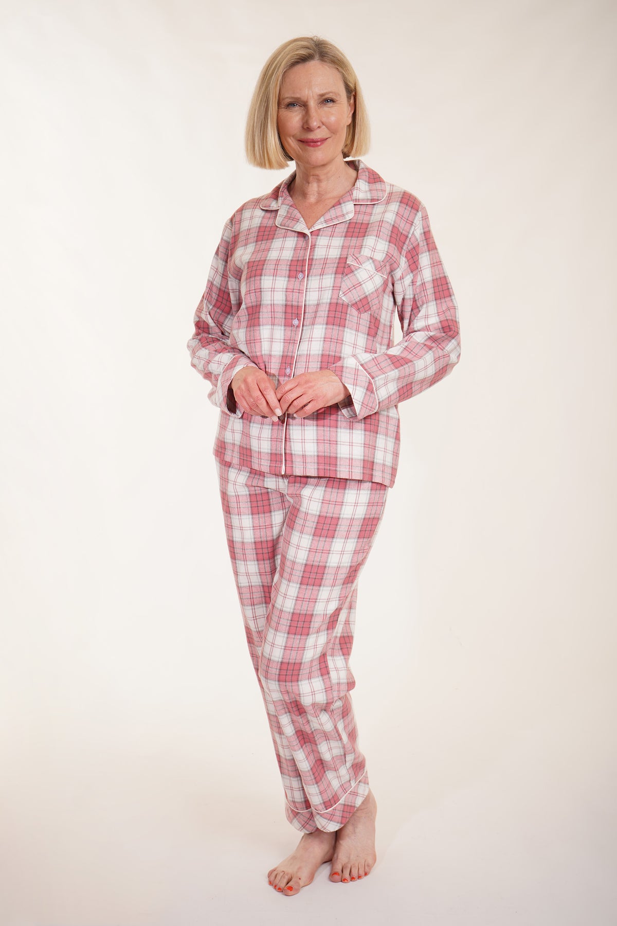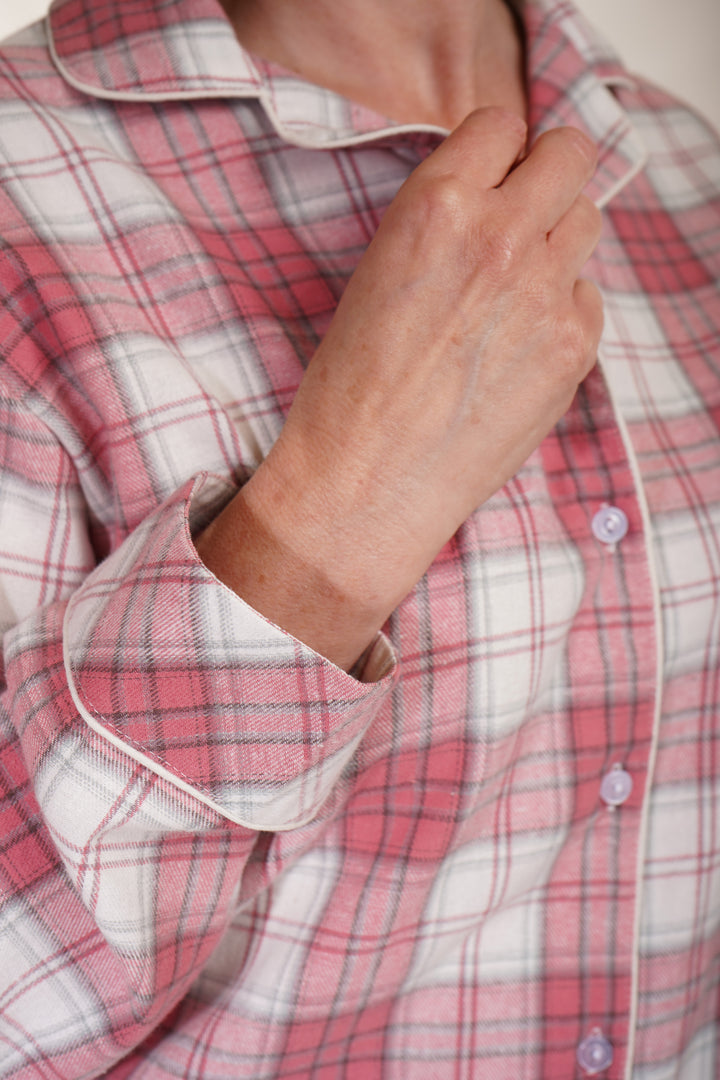 Luxurious cotton pyjamas in an all over chequered print, perfect for keeping you warm in the colder months. Designed in a traditional button through tailored pyjama top with long sleeves. Featuring solid colour piping detail to the collar and breast pocket. Fully elasticated trouser to match. Top back length from 25" / Inside leg from 29". 100% cotton.