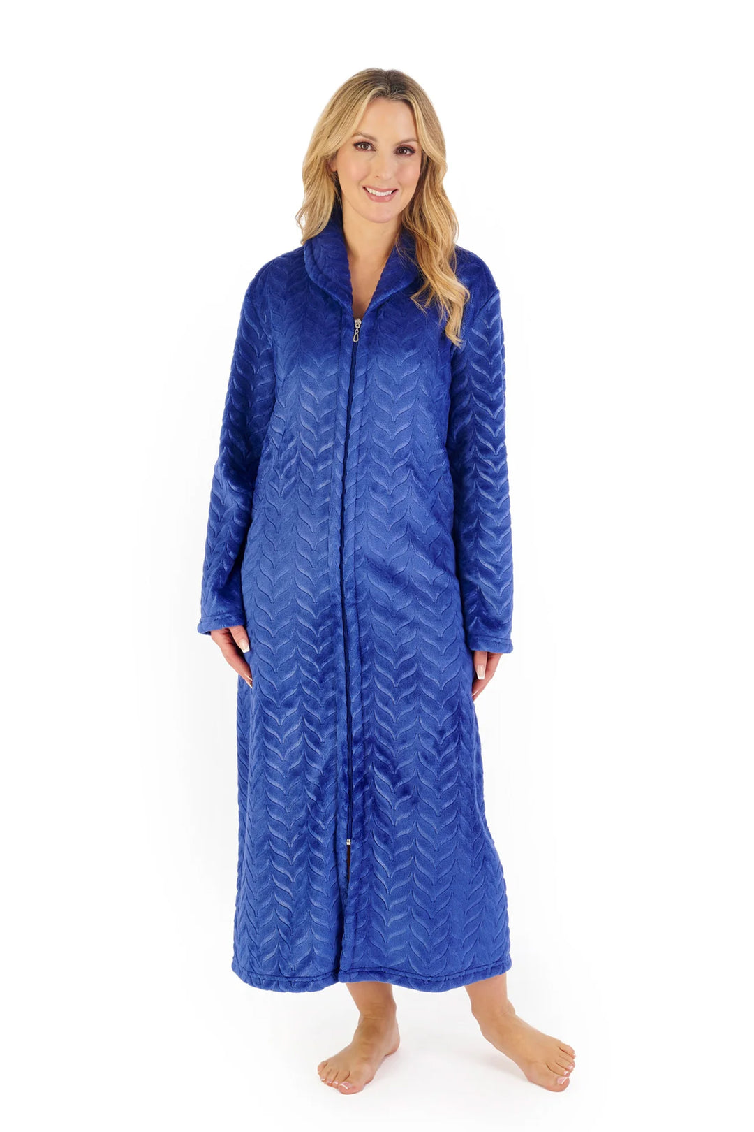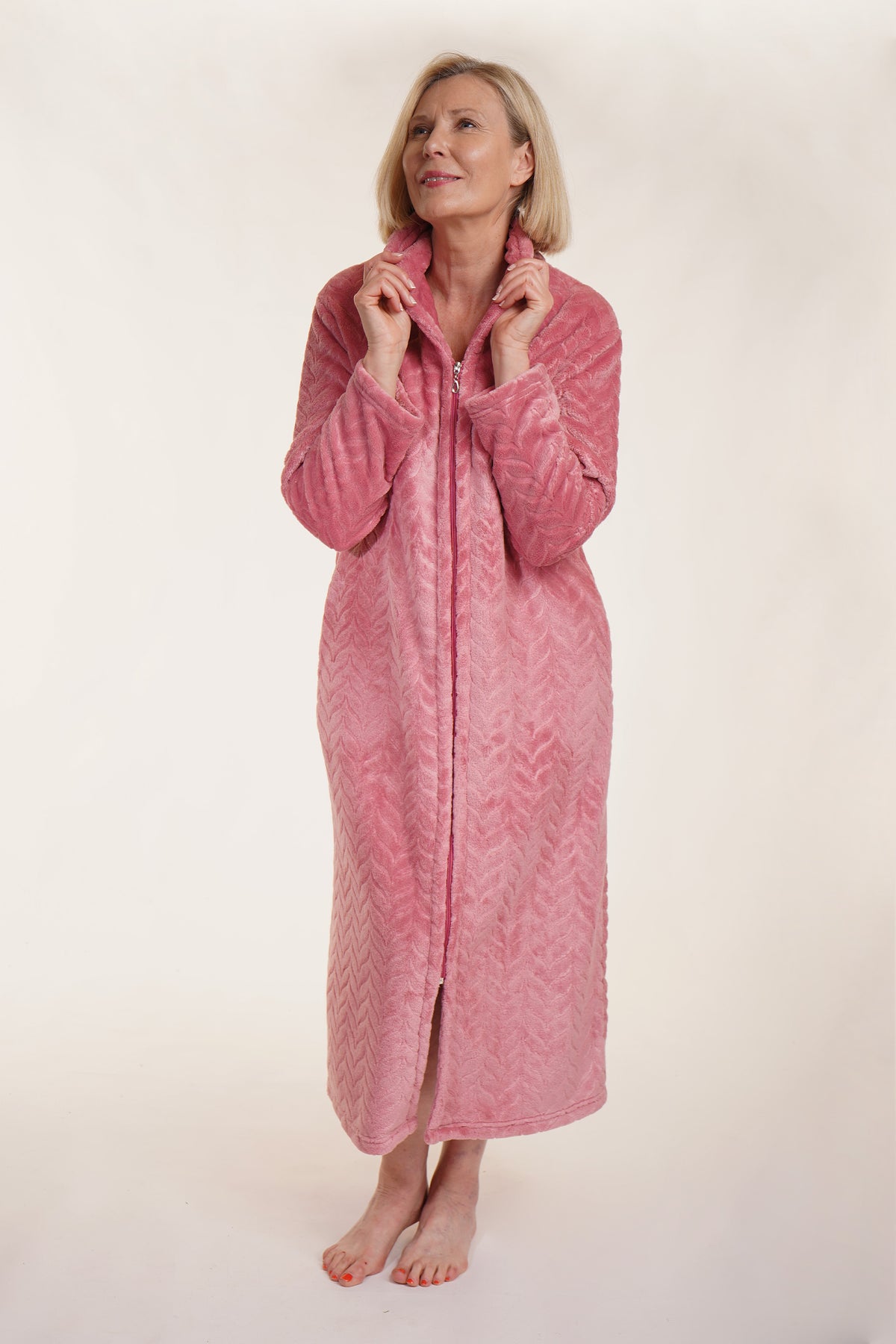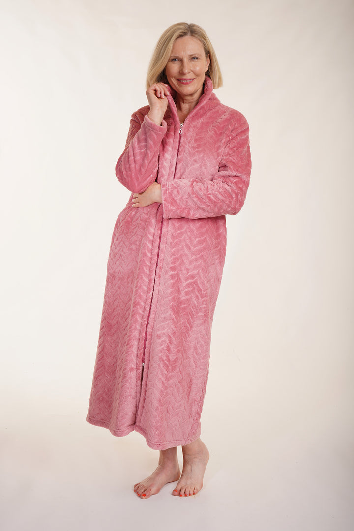 Classic fleece housecoat with zip fastening. Designed with a shawl collar design and long sleeves for warmth. Finished with an embossed herringbone pattern. 100% polyester. Length 50".
