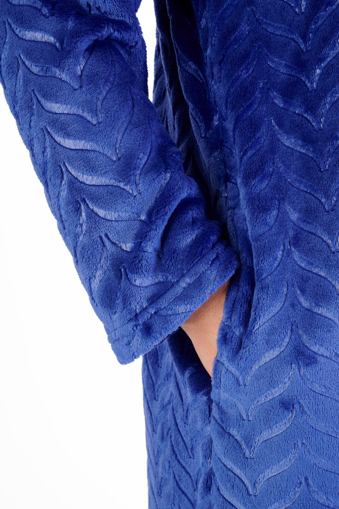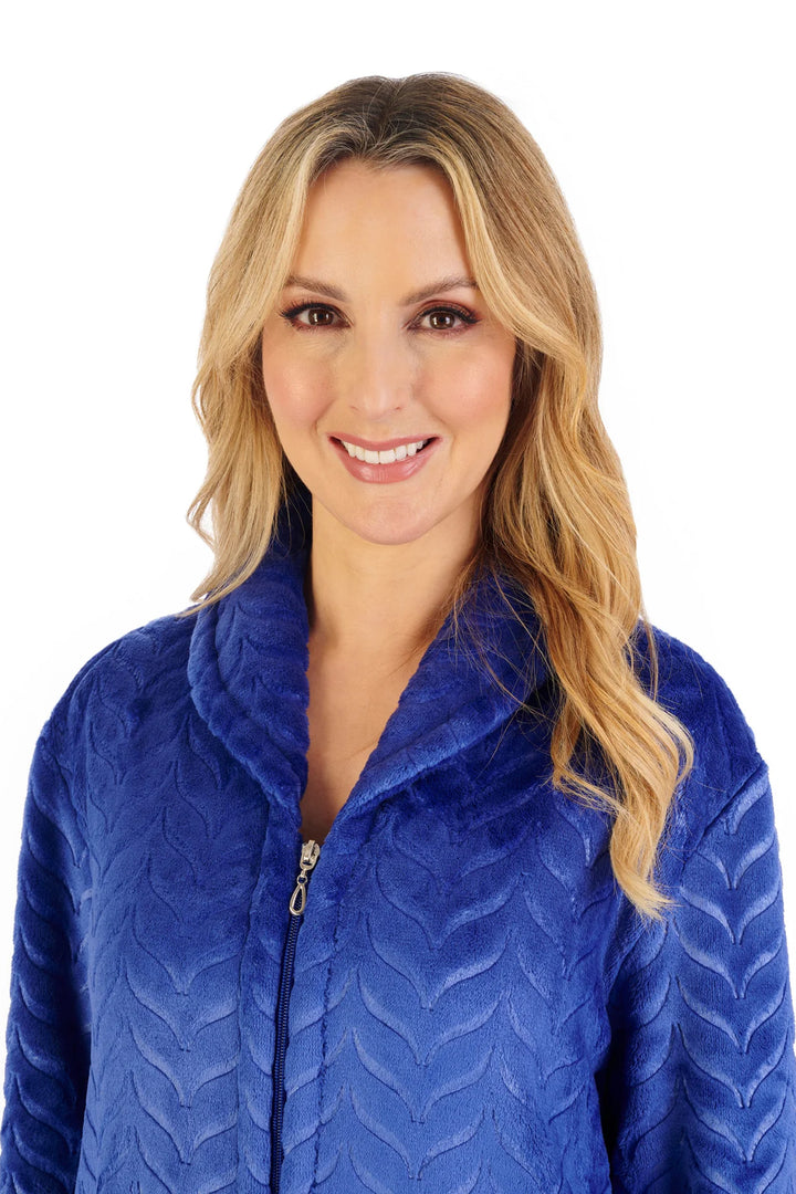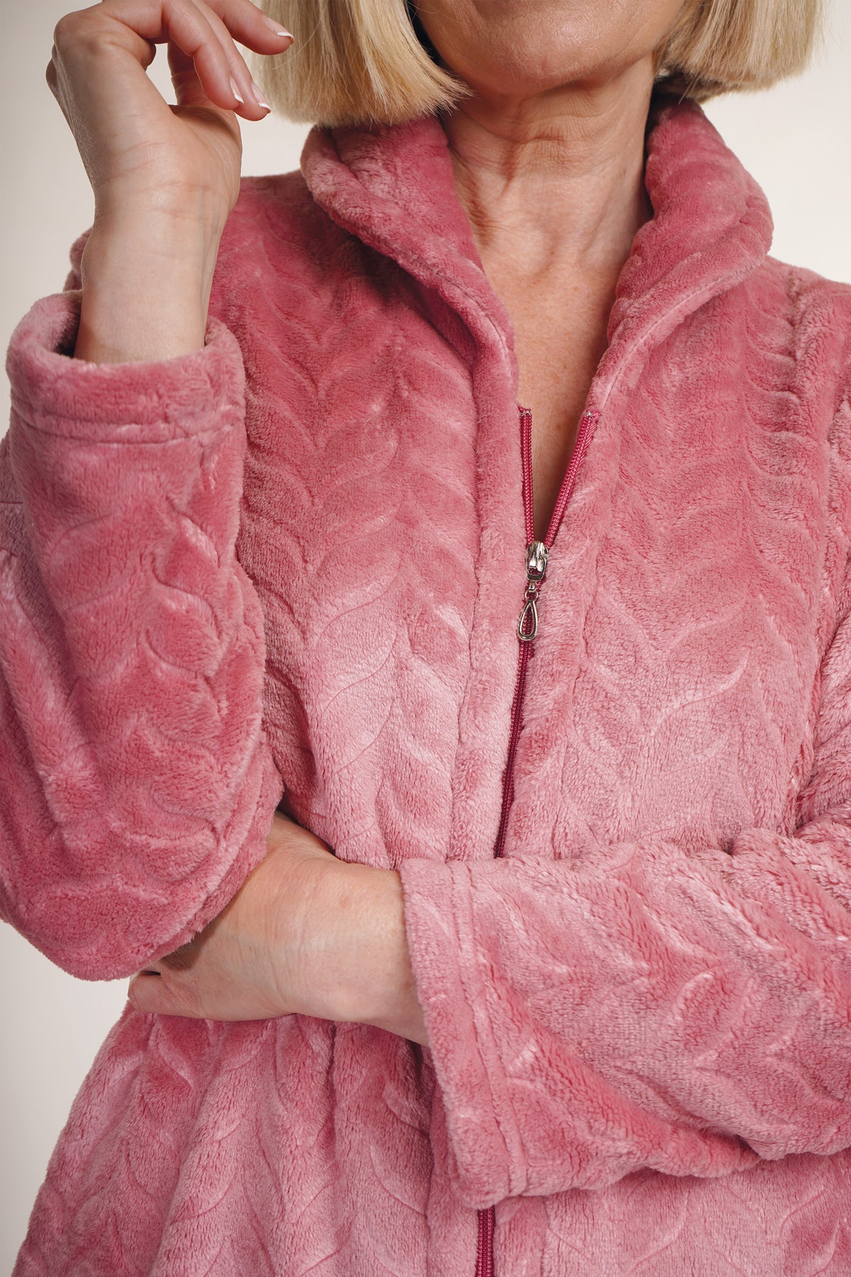Classic fleece housecoat with zip fastening. Designed with a shawl collar design and long sleeves for warmth. Finished with an embossed herringbone pattern. 100% polyester. Length 50".