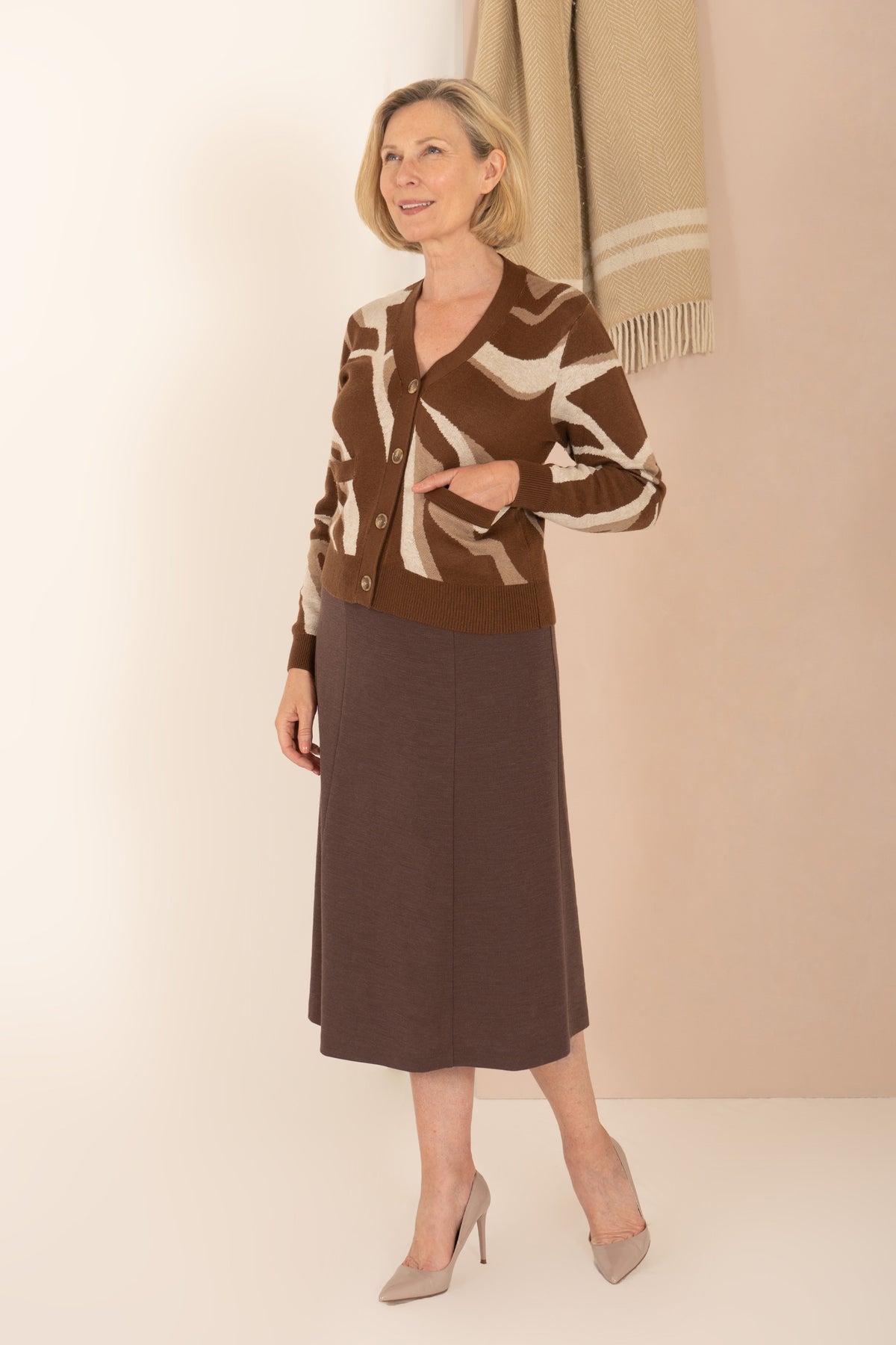 Luxuriously crafted, this statement knit features an elegant jacquard print design in a neutral colour palette made from soft wool blended yarn. Featuring a v neckline and button fastening with two front patch pockets. Finished with tortoise shell button design, ribbed cuffs and hem. Machine washable at 30. Back length from 20.5”. Made by Poppy.