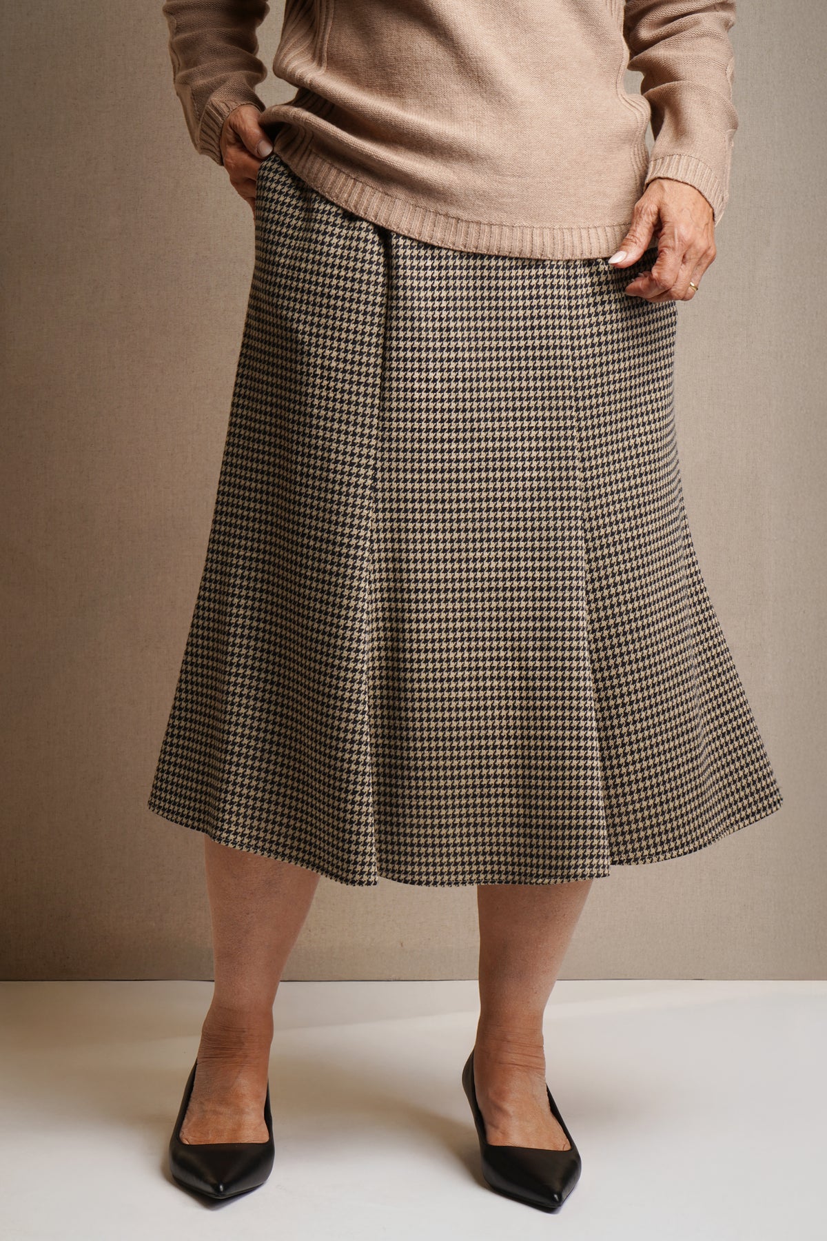 The Kenny Fluted Skirt features six carefully tailored panels with a distinctive dog-toothed design, creating a refined silhouette that elevates any wardrobe. Its structured yet feminine shape offers timeless elegance, making it a versatile staple for both professional and stylish casual occasions. Embrace sophistication with this effortlessly chic skirt. Machine washable at 30 degrees. 85% acrylic, 14% polyester, 1% elastane.