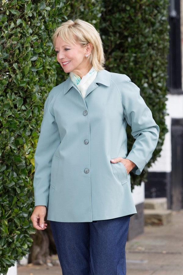 Classic three quarter coat, shower and windproof. Features buttons to the neck, raglan sleeves and jetted pockets. Cuff tab trim and centre back seam. Generous classic fit. 100% teflon coated polyester. Back length from 30".
