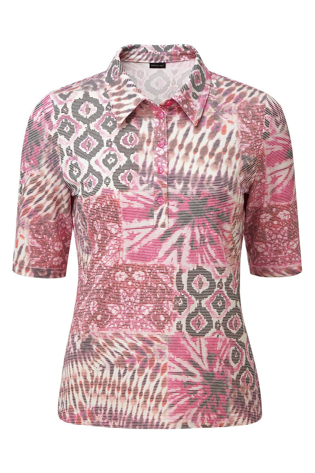 Modern abstract line print from designer, Lebek. Made from a super soft and lightweight fabric, this classic polo collar style top would be a perfect addition to brighten up your Spring wardrobe. Neat collar with button to the neck five button placket and half sleeves. Back length from 24”. Machine washable. 96% viscose, 4% elastane.