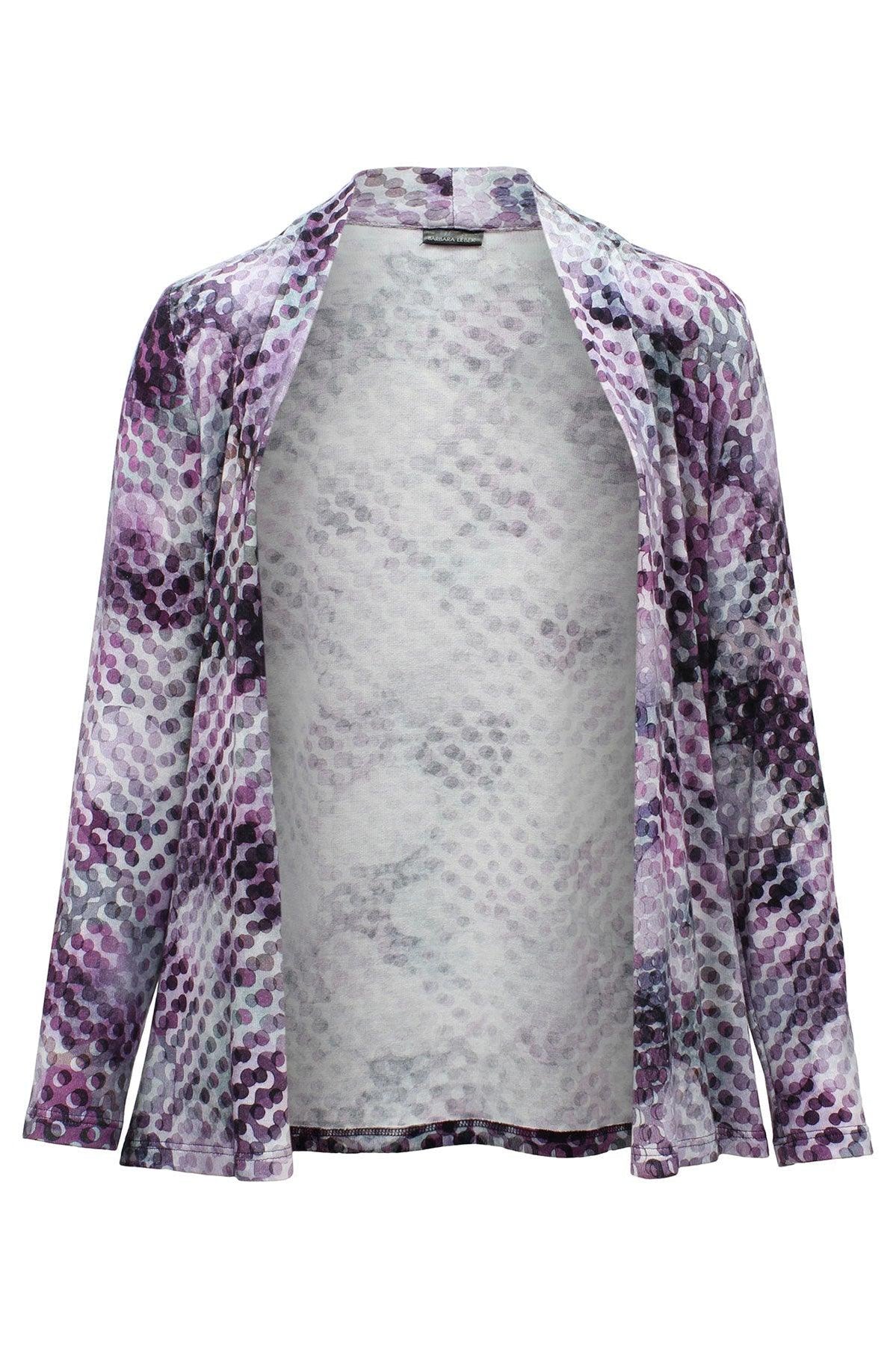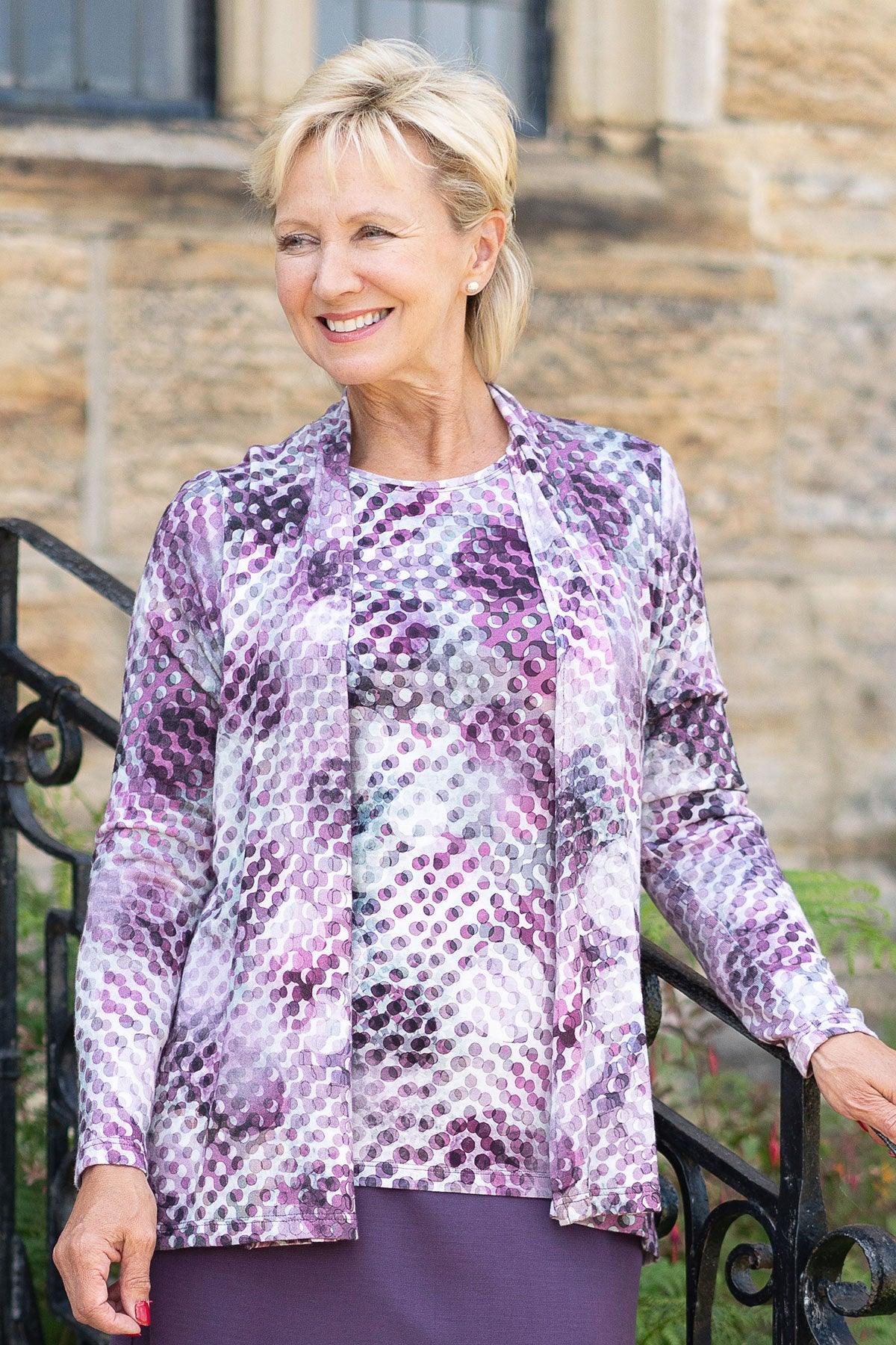 Designer Lebek has created a beautiful waterfall design cardigan in their favourite ‘ever so soft’ fabric. Features a bubble print design in shades of grey and mauve. Back length from 27”. Machine washable.