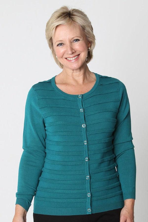 Make a simple outfit stunning with this luxury cardigan from Marble. Deep round neck and self covered buttons. Semi fashioned set in sleeve. Machine washable. 72% viscose, 28% nylon.
