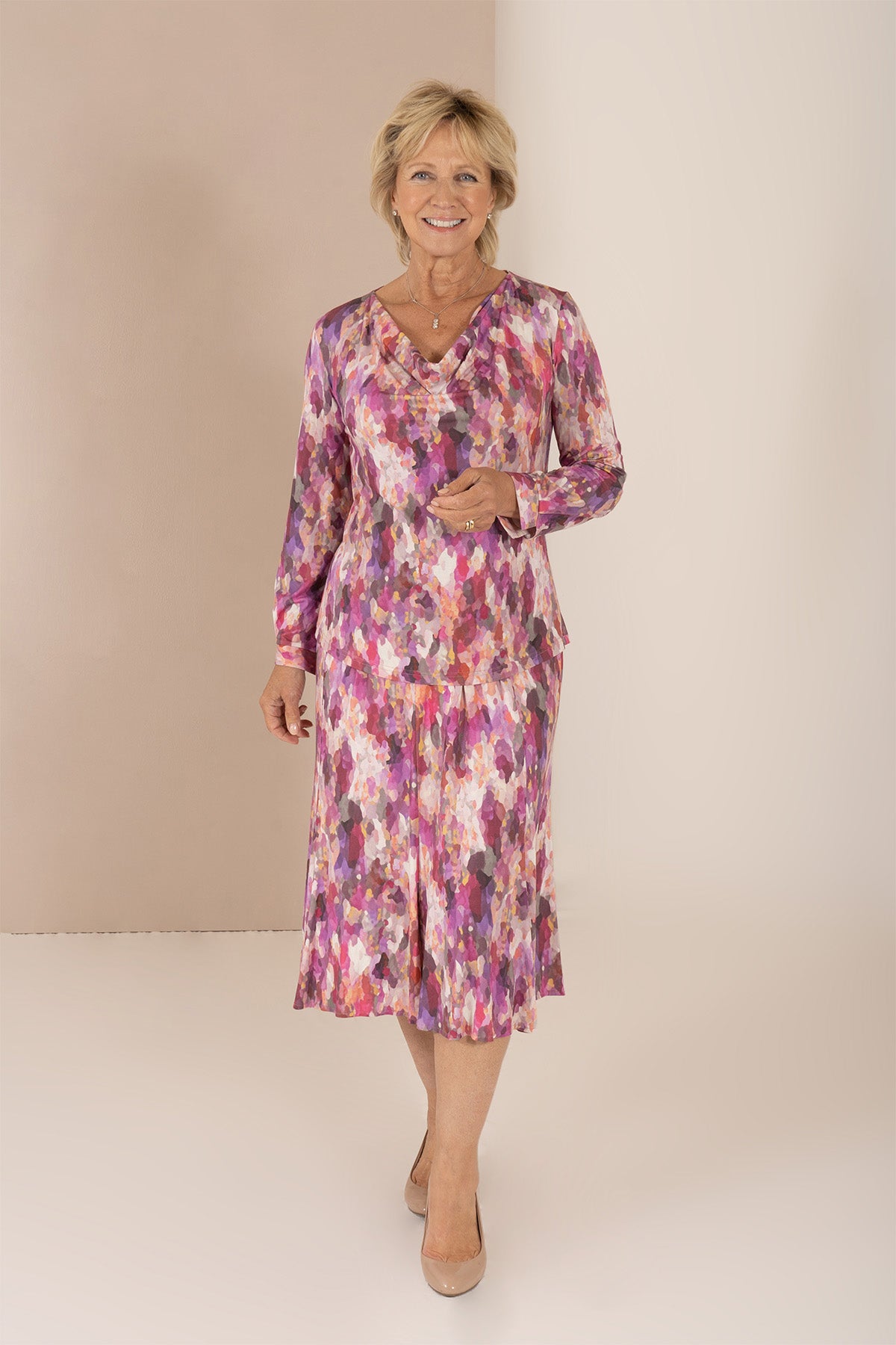 Long sleeve top with flattering cowl neckline. Button cuff and side splits for a perfect fit. Wear with matching Monet Skirt (S513) to make a versatile outfit. Machine washable. 95% viscose, 5% lycra. Made by Carr & Westley.