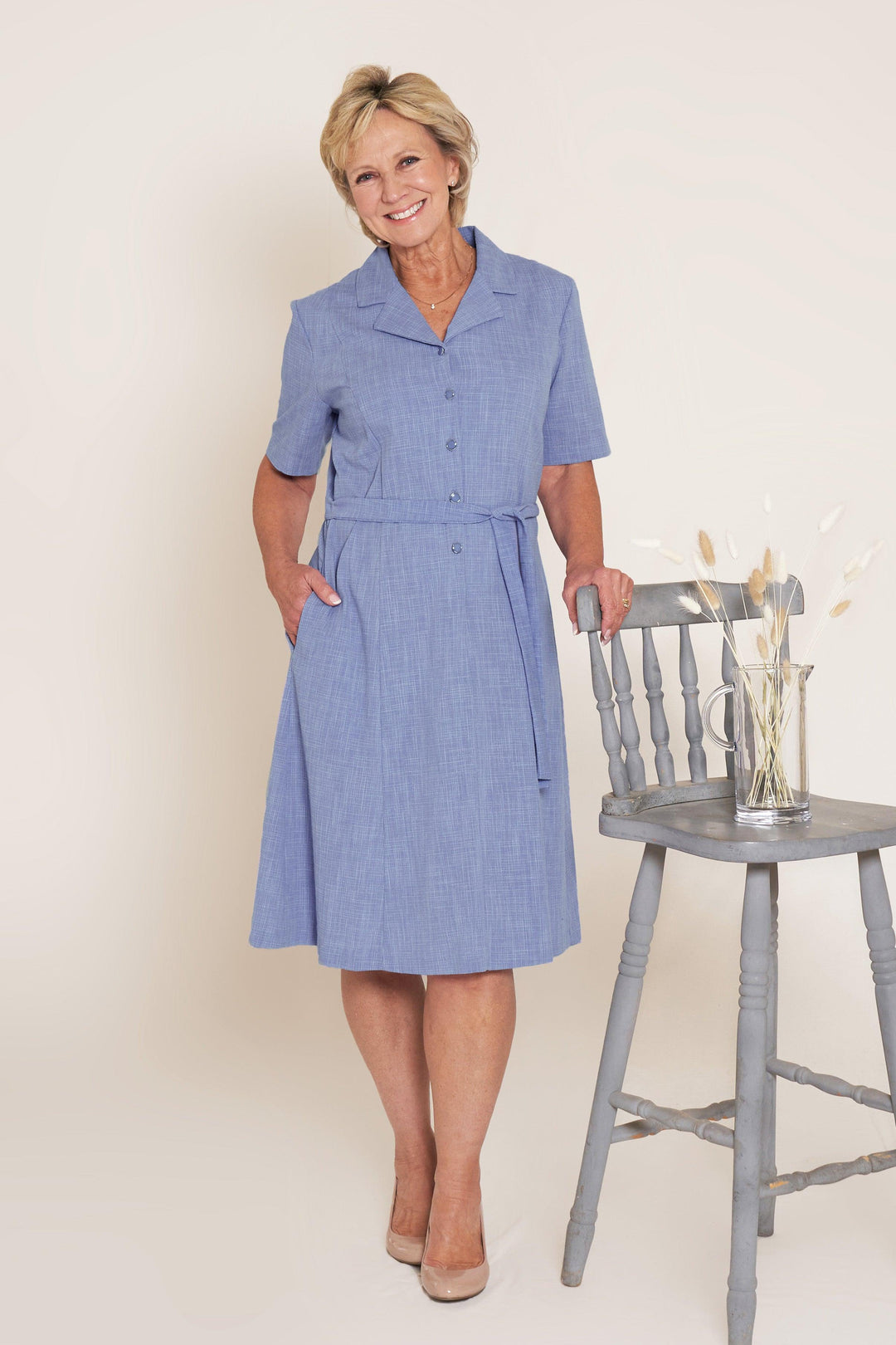Everyday easy-care waffle weave dress styled in a flattering princess line with three-quarter button placket and revere collar. Concealed side pocket, optional tie belt and pleat in back. Classic Carr & Westley style. 50% Polyester 45% Cotton.