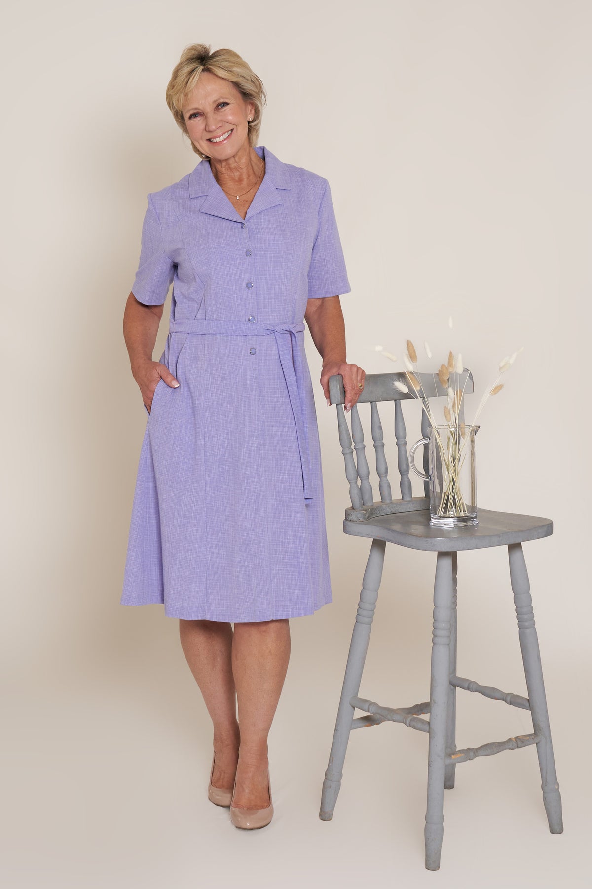 Everyday easy-care waffle weave dress styled in a flattering princess line with three-quarter button placket and revere collar. Concealed side pocket, optional tie belt and pleat in back. Classic Carr & Westley style. Machine washable at 30. 50% Polyester 45% Cotton.