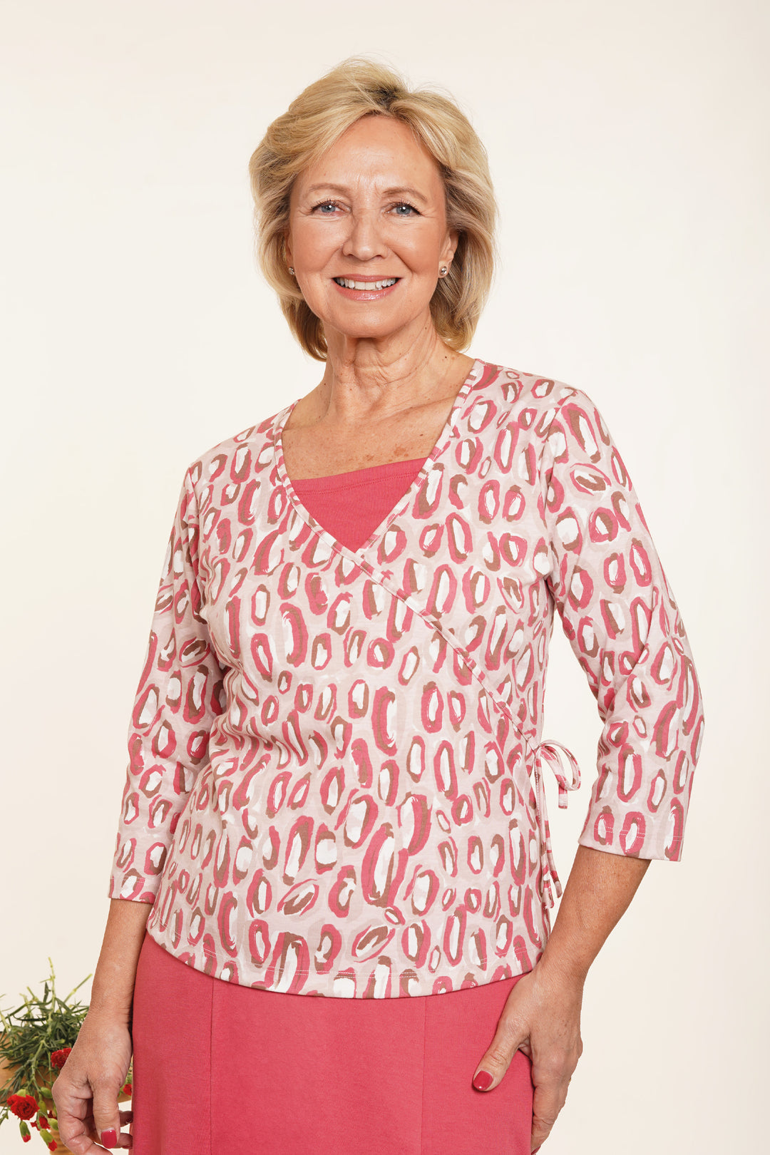 Stand out in style with this sophisticated Pebble Wrap Top. Crafted from a soft fabric and featuring an all-over pebble print design with tie detail and plain insert for modesty. Finished with three-quarter sleeves, its exclusive rose colour will lend a luxury feel to any look. Back length from 23”. Machine washable at 30 degrees. 65% polyester, 35% cotton.
