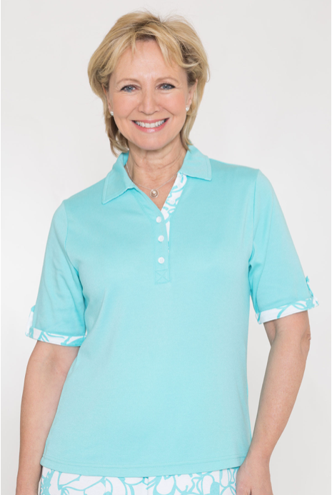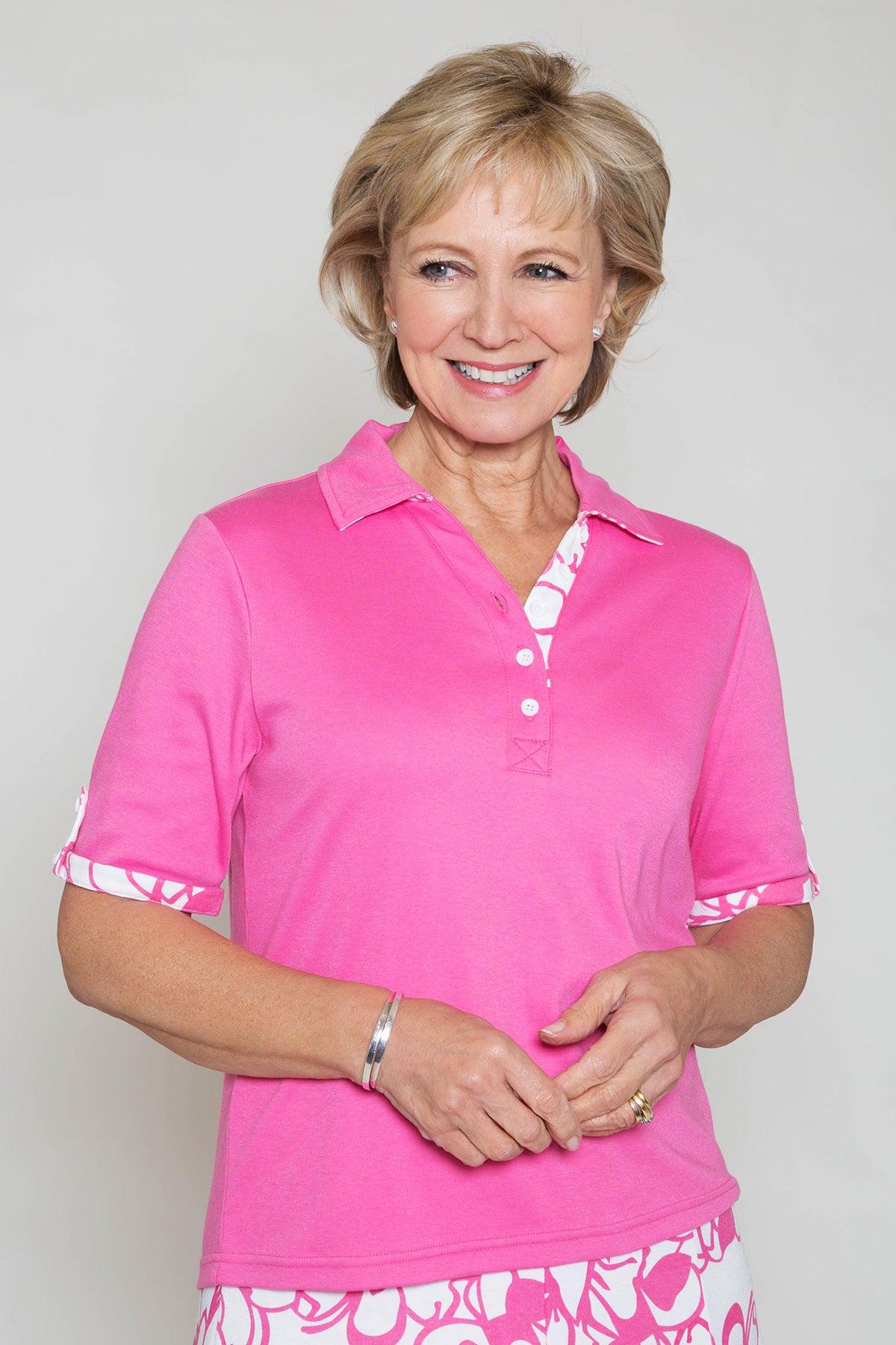 Soft jersey, collared top by Poppy. Features abstract floral print trim on collar reverse, sleeve cuff and placket facing. Five button detail, three of which fasten. Short sleeves and side splits. Back length from 23 inch. Machine washable. 65% polyester, 35% cotton.